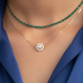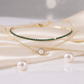 The elegant double-layer rhinestone chain in this pendant set is meant to exude style with a contemporary twist. The necklace, which is adorned with brilliant emerald crystals, sparkles exquisitely and gives the design a striking splash of color. Shining rhinestones and a delicate pearl crystal pendant in its heart create the ideal balance of traditional charm and modern design. The neckline is accentuated by the layered construction, which provides a sophisticated and striking look appropriate for a variety of settings. The combination is completed with matching earrings, guaranteeing a well-coordinated and sophisticated appearance. It is perfect for formal meetings, parties, and festive celebrations because it is both lightweight and eye-catching. This set embodies classic sophistication and exquisite beauty with its tasteful combination of crystals, pearls, and layered