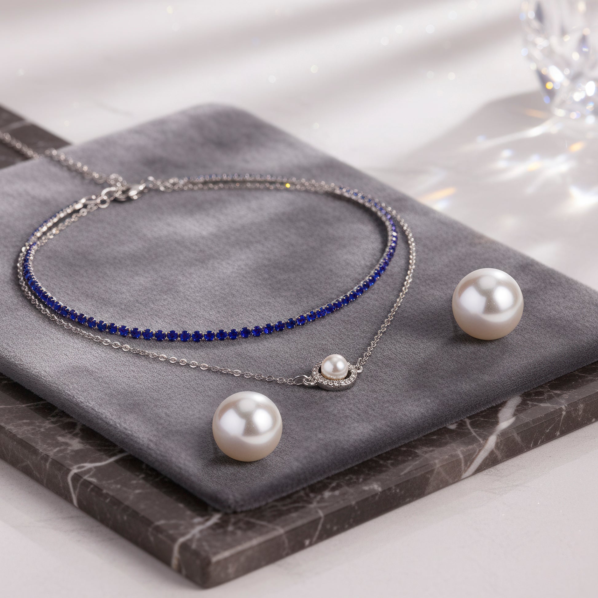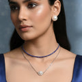 The exquisite double-layer rhinestone chain that adorns this pendant set exudes style and allure. It adds a rich and elegant touch to the entire appearance when highlighted with glistening blue sapphire gems. A tiny pearl crystal pendant at the center provides timeless elegance, harmonizing flawlessly with the deep blue highlights and the rhinestones' brilliance. The layered pattern adds a sophisticated and contemporary touch to the neckline, making it a perfect option for both formal and celebratory settings. The combination is completed with coordinated earrings, which provide a sophisticated and polished look. This piece is beautiful yet lightweight, and it can be easily styled to add flair to any ensemble. It embodies elegance, adaptability, and modern grace by fusing classic pearl appeal with sapphire brilliance.