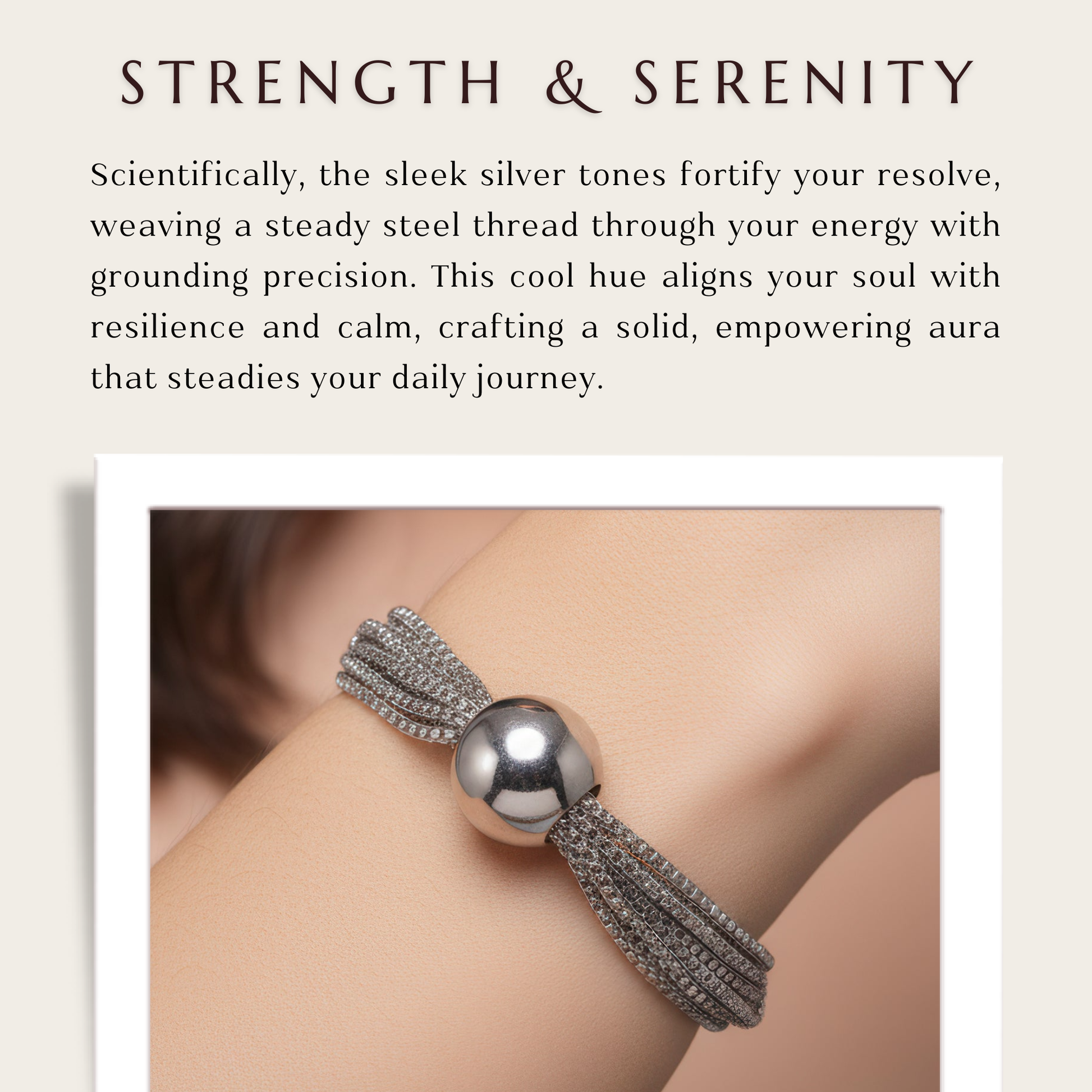 This bracelet is a must-have for anyone who enjoys distinctive statement accessories since it combines sophisticated elegance with a striking modern touch. Its design, which combines several elegant box chains, gives it a layered appearance that flows nicely around the wrist while providing rigidity and fluidity. Its charm is increased by the addition of polished metal ball accents, which give the design a whimsical yet elegant edge. The smooth surface, which was meticulously crafted, guarantees comfort for all-day use while preserving its fashionable look. With its adaptable sheen, it effortlessly enhances any ensemble and is ideal for both formal and informal settings. This bracelet, which may be worn alone or combined with other jewelry, is a stunning combination of classic design with modern flair.