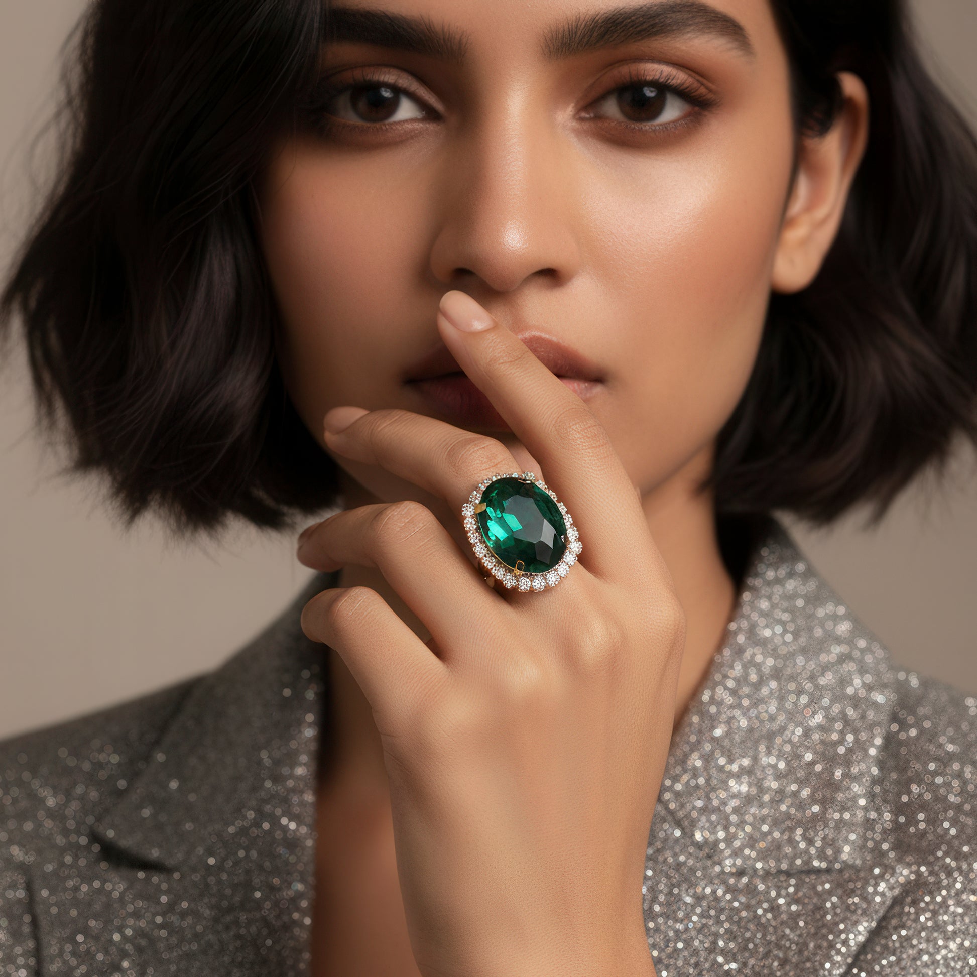 The dramatic and glitzy appeal of this statement ring is meant to draw attention. A big oval crystal, expertly cut for maximum brilliance and sparkle, sits at its center, magnificently reflecting light from all directions. For people who enjoy jewelry that exudes confidence, the large style makes it a real cocktail item. It may be worn comfortably all day or all night because to its smooth finish and expertly made band, which guarantee comfort and longevity. Adding a sparkling addition to any ensemble, this ring is ideal for celebrations, parties, and special events. It instantly enhances the appearance when worn with sophisticated gowns or stylish evening clothing, making it an essential piece for any jewelry enthusiast.