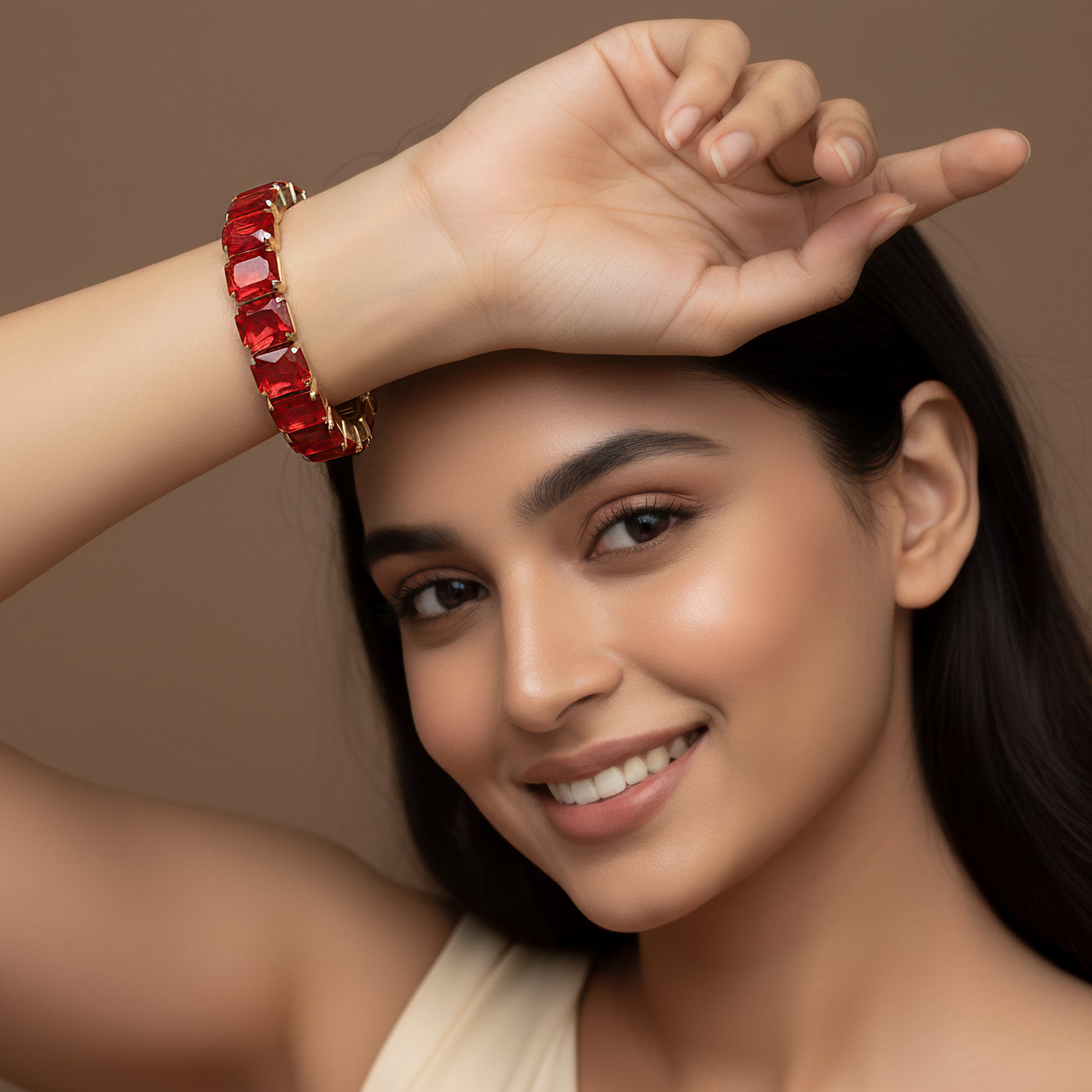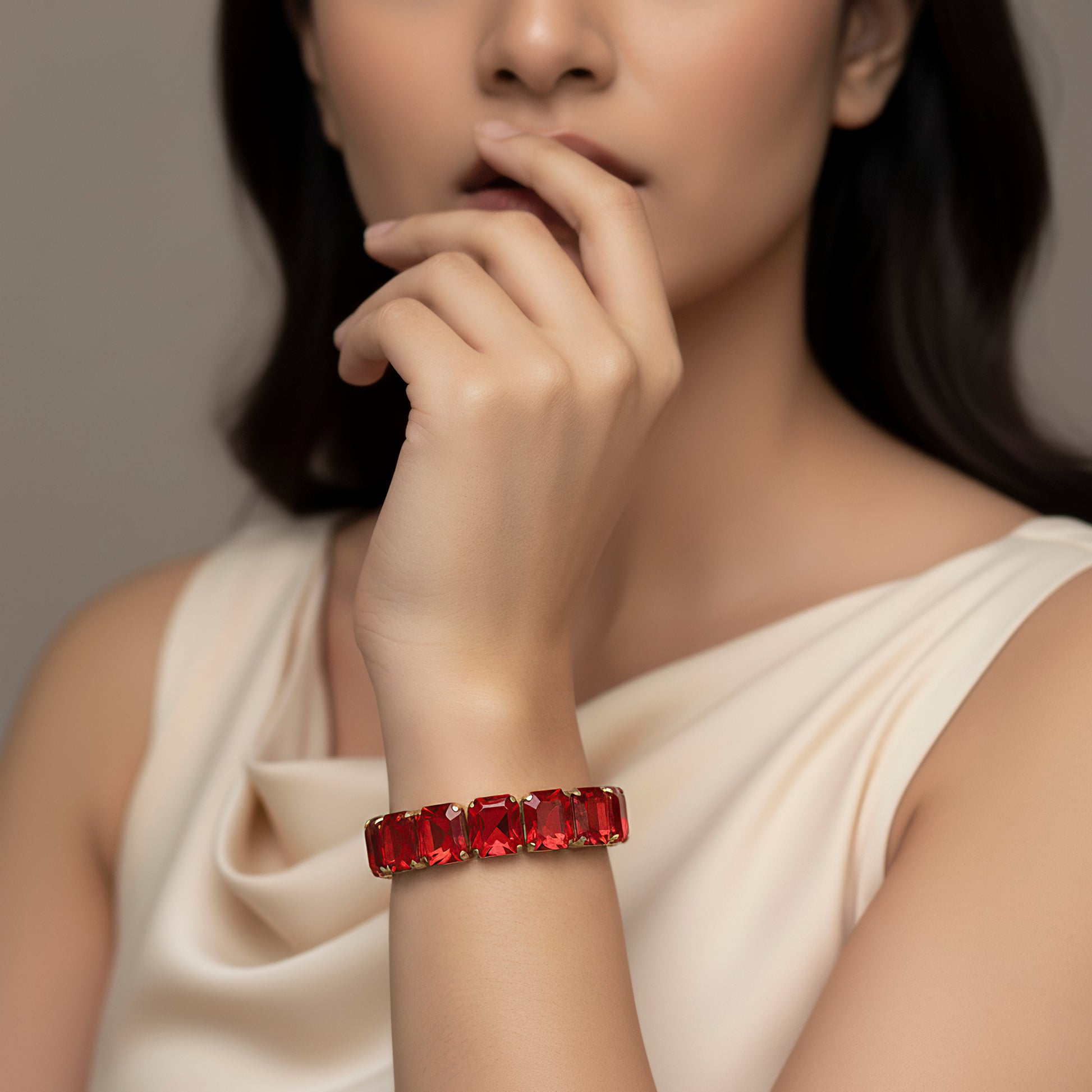 This gorgeous stretch bracelet with glowing red crystal stones will add a lively touch to your accessories collection. Every crystal has been expertly positioned to reflect light in a stunning way, producing a stunning impact that elevates both festive and everyday ensembles. All wrist sizes can wear it comfortably and securely because to its elastic design, which makes it a versatile piece for both special occasions and daily fashion. Its striking red color represents fervor and vitality, while the glittering finish adds a touch of refinement and allure. This adaptable accessory gives the perfect amount of sparkle to finish any ensemble with effortless sophistication, whether it is worn alone as a showcase piece or stacked with other bracelets for a stylish layered look.
