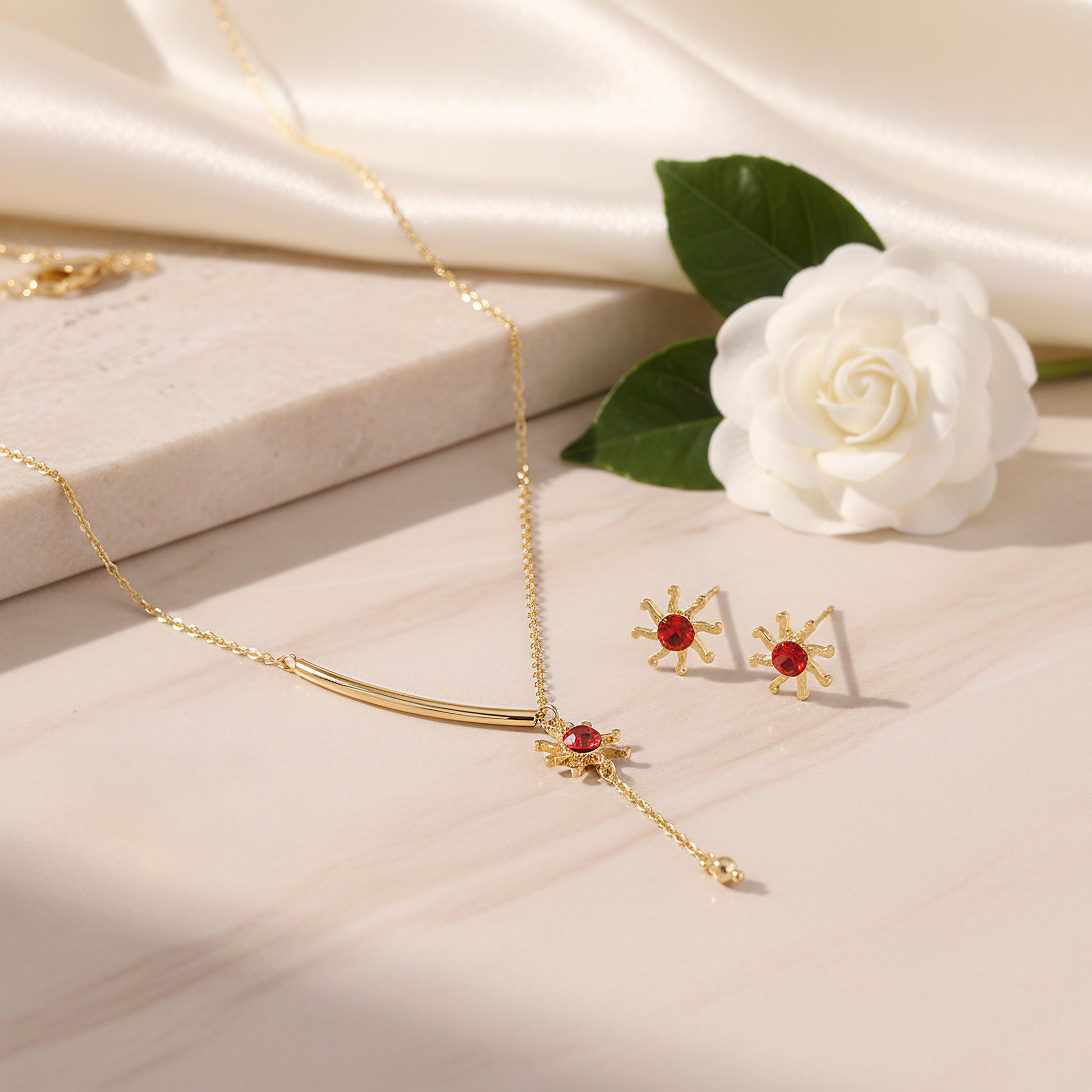This sophisticated necklace with a tiny pendant inspired by the sun will add radiance to your ensemble. The pendant, which is exquisitely decorated with fine crystal detailing that captures the brilliance of sunlight, is crafted in a dazzling gold finish. A brilliant red crystal, which represents warmth, passion, and energy, sits at the center of the design, giving it both significance and visual appeal. Its opulent appeal is further enhanced by the delicate shimmer imparted by the elaborate arrangement of small crystals surrounding the centerpiece. The necklace, which hangs from a sleek gold-toned chain, is the ideal combination of statement style and minimalism. Lightweight and adaptable, it goes well with both festival and evening clothes as well as daily ensembles. This classic piece adds a sophisticated dash of glitz and style to any event.