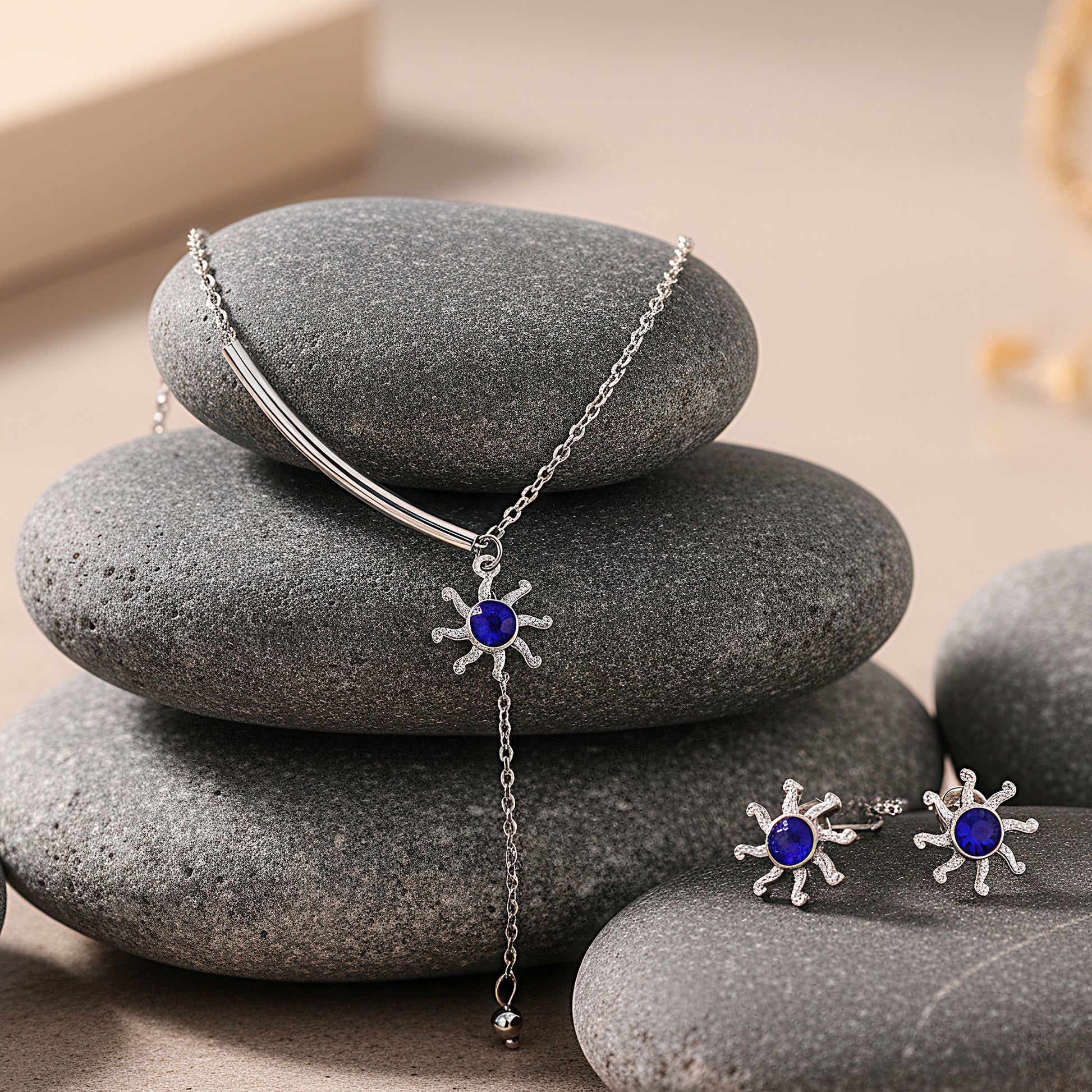 This sophisticated necklace, which has a sleek silver finish and a tiny sun-shaped pendant, will add radiant appeal to your ensemble. Delicately set with tiny gems, the pendant shimmers subtly like sun rays as it reflects light with each movement. A stunning blue sapphire crystal, representing strength, wisdom, and tranquility, sits in its core. The pattern achieves depth and refinement from the striking contrast between the deep blue hue and the surrounding stones' brilliance. The necklace, which hangs from a classy silver-toned chain, combines classic charm with understated elegance, making it appropriate for big events as well as everyday wear. This accessory, which is lightweight and adaptable, adds a subtle shine and a declaration of elegant grace to any ensemble.