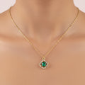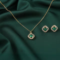 This minimalist pendant necklace set, with its stylish square structure that combines traditional charm with contemporary sophistication, exudes elegance. Sparkling AD stones and delicate pearl accents wonderfully compliment the pendant's rich emerald crystals, which radiate a deep, mesmerizing green. It is a piece that can be worn to major events as well as daily because every element has been carefully designed to accentuate its elegant appeal. The pendant, which is suspended from a slender chain, adds a well-balanced touch of elegance and glitter, and the matching square-shaped tips give the ensemble a classic charm. This combination, which is lightweight and pleasant to wear, instantly elevates any ensemble, whether it is used with traditional clothing or more modern looks for a professional look.