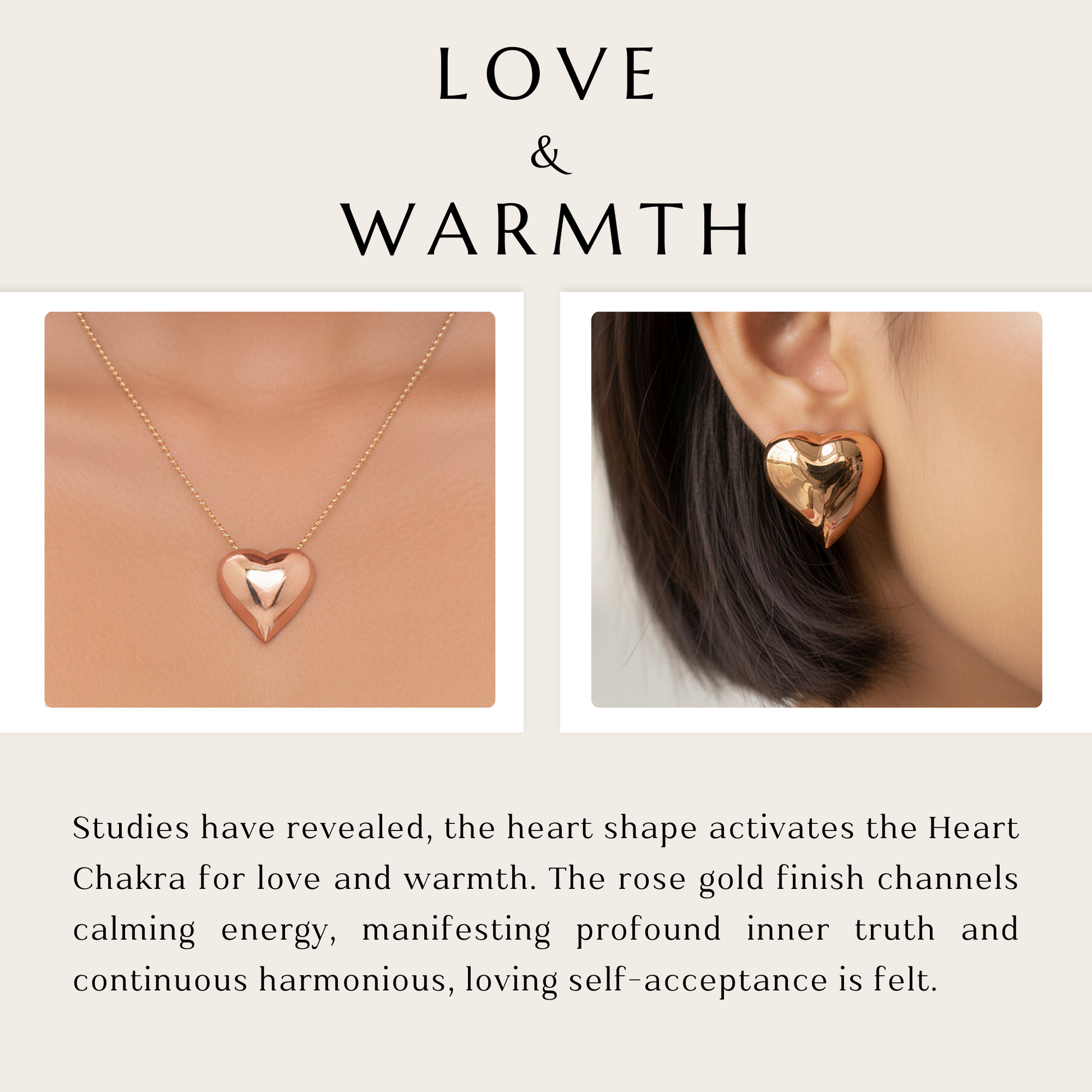 This lovely necklace and earring combination, which is carved in a beautiful rose gold finish, will add a touch of romanticism to your collection. The design adds a whimsical yet sophisticated touch to your style with its puffy heart motif, which stands for warmth and love. The heart pendant on the necklace hangs elegantly on a modern chain, and the accompanying earrings have the same design for a well-coordinated ensemble. Its lustrous sheen and delicate rose color are enhanced by the way light bounces off its polished surface. This set is comfy and lightweight, making it perfect for both special occasions and everyday wear. It is classic and adaptable, whether worn as a personal style statement or given as a token of love.