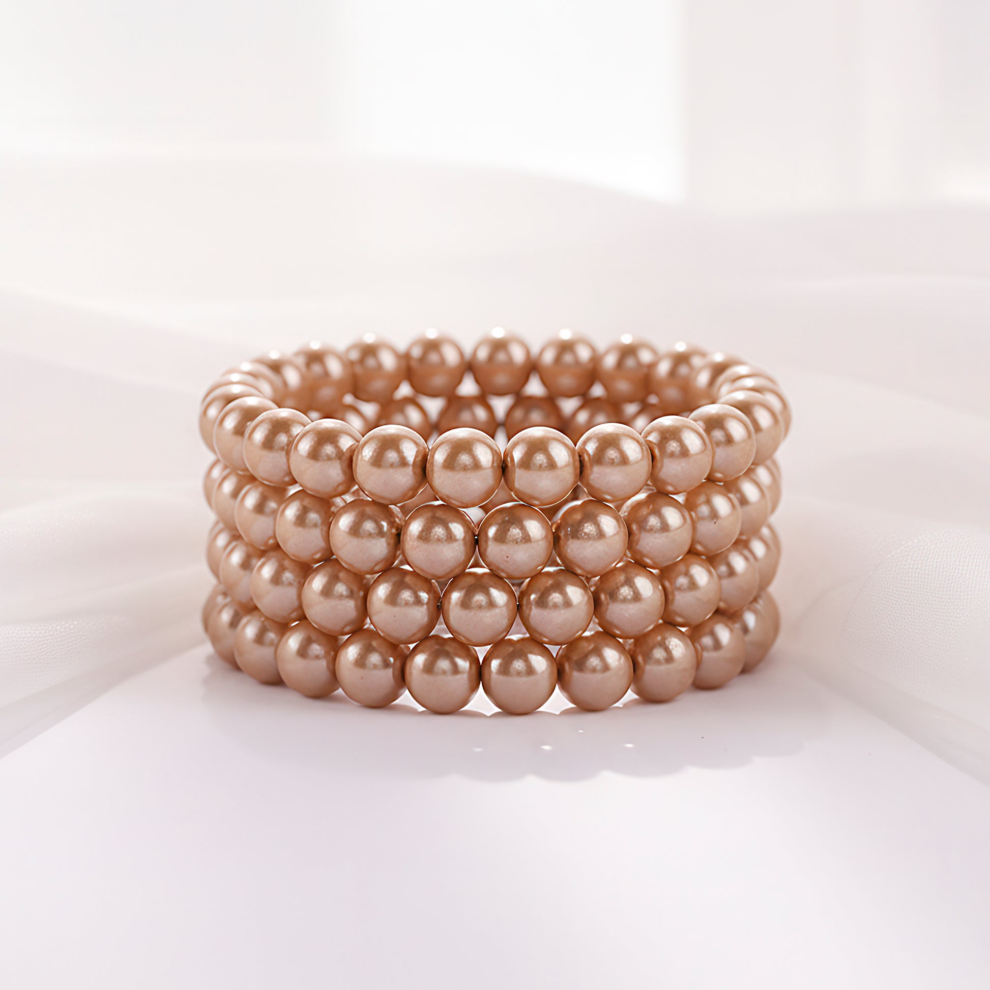 Warm golden-brown pearls are grouped in a sophisticated spiral pattern on this gorgeous bracelet, which swoops elegantly around the wrist. While the natural pearl sheen offers a gentle glow that goes well with both traditional and modern styles, the earthy golden tones add a hint of refinement. It is simple to wear all day long thanks to its flexible spiral structure, which guarantees a snug but comfortable fit. This bracelet lends a sophisticated charm to any attire and is ideal for festive occasions, evening get-togethers, or informal outings. It adds classic beauty to your look whether you wear it alone as a focal piece or combined with other items. It is a multipurpose item that also makes a classy and considerate present for someone who values timeless beauty.