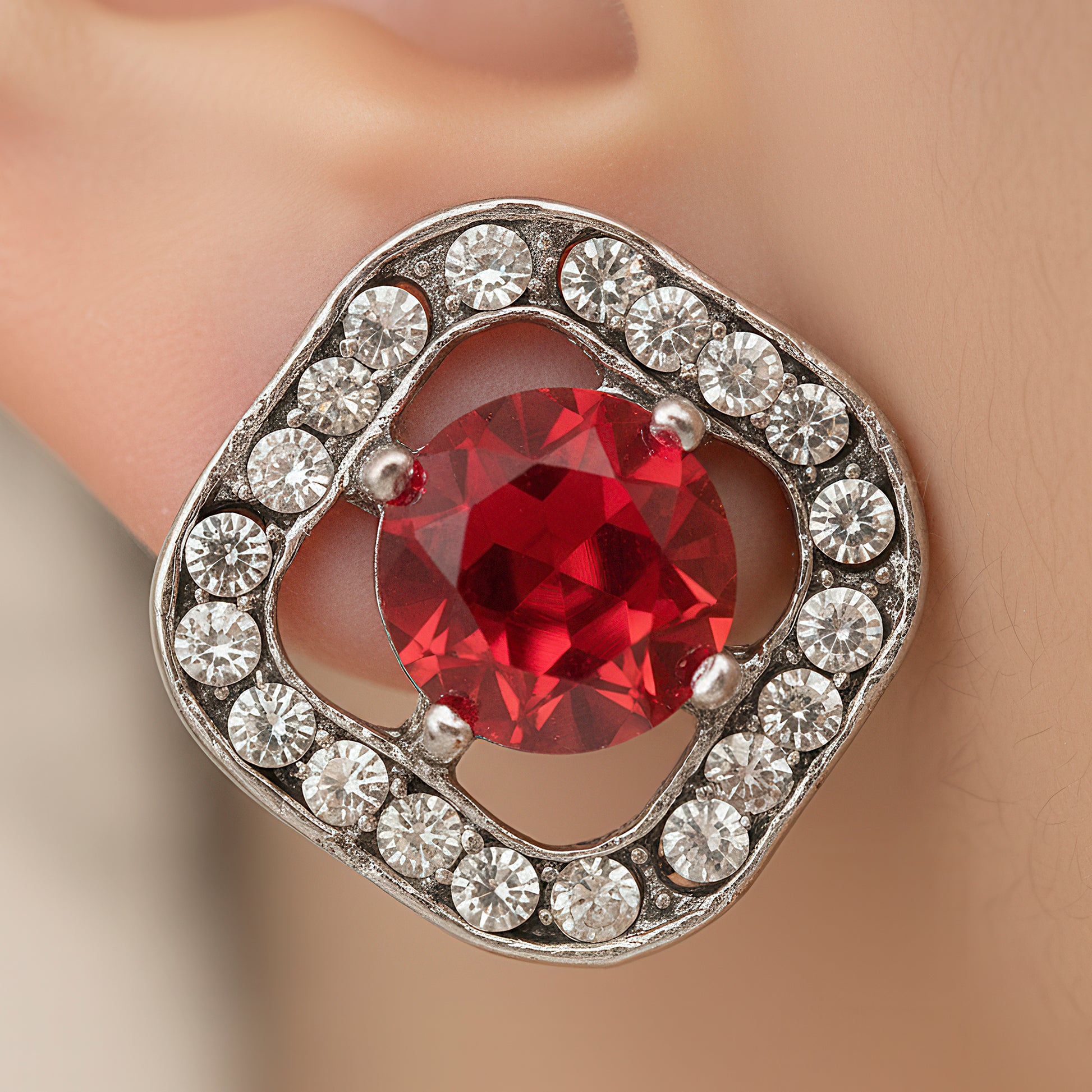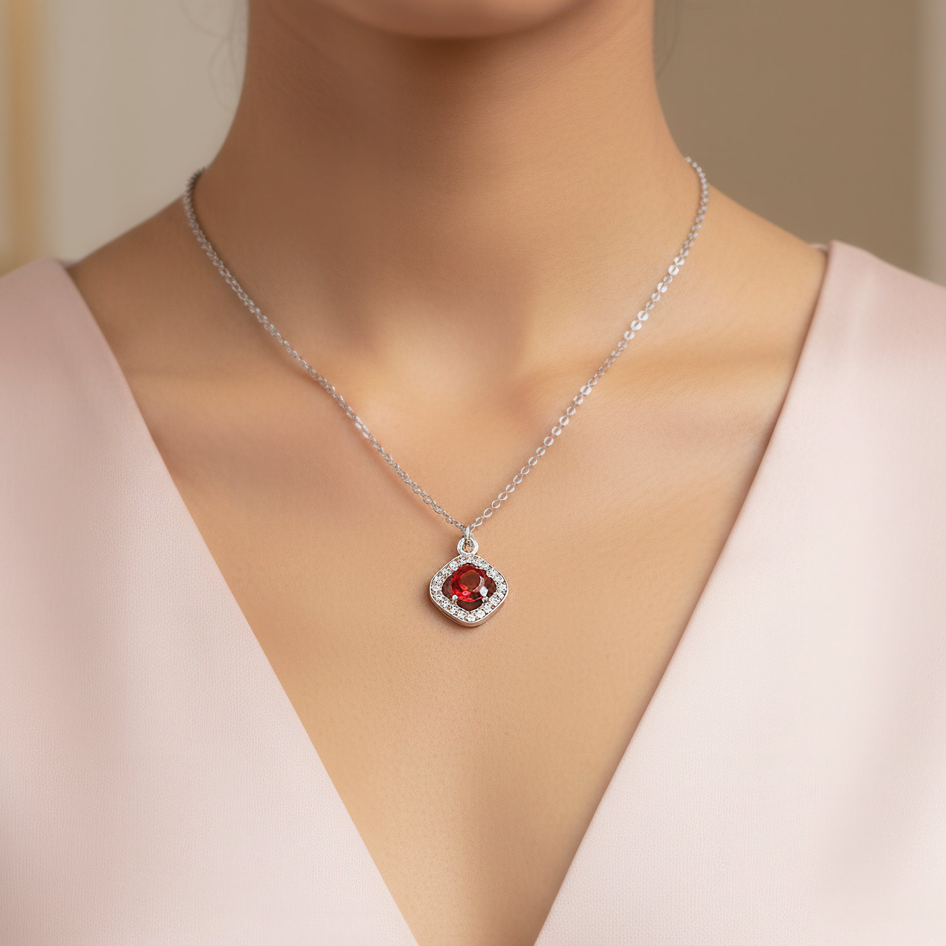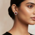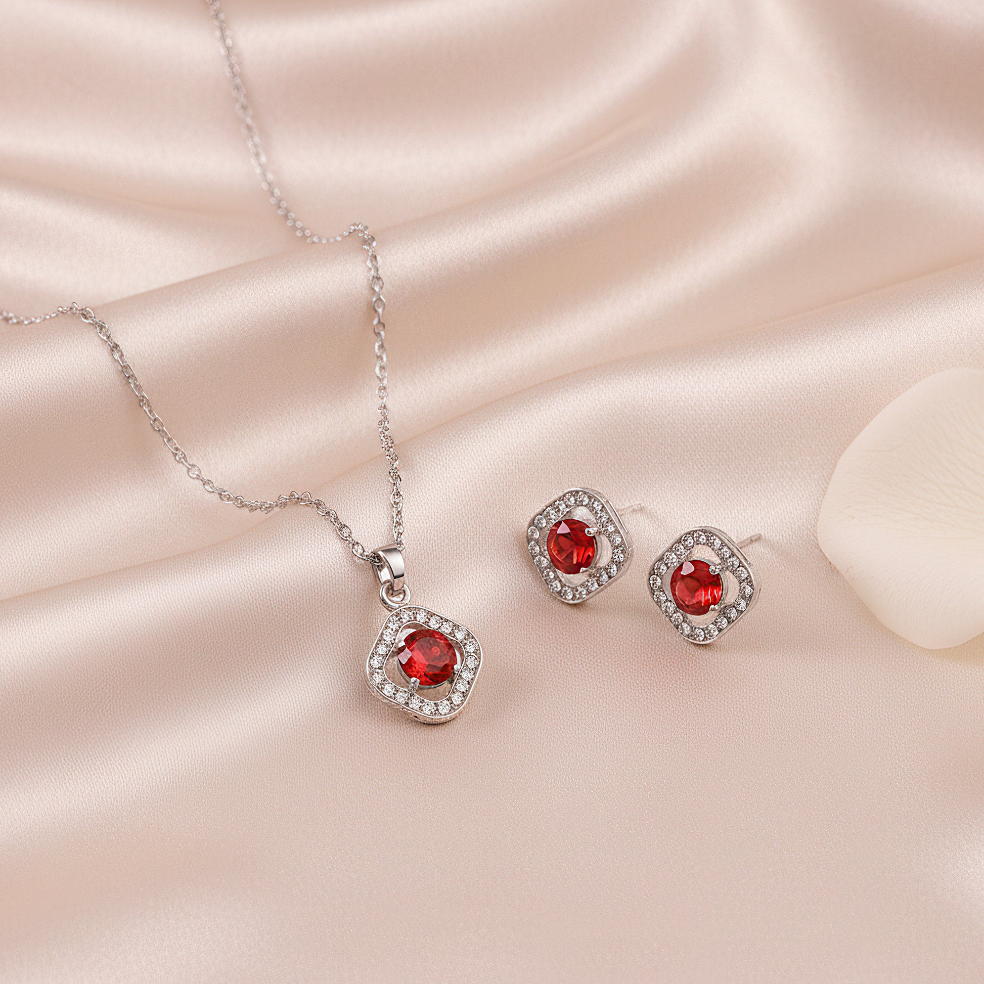 This exquisite pendant necklace set exemplifies a magnificent fusion of style and simplicity. It is made in a sophisticated silver tone and has a square pendant with beautiful American diamonds and sparkling red crystals that are further accentuated by glossy pearls. The pendant's elegant shape is reflected in the matching tops, which produce an exquisitely balanced appearance. This lightweight set adds a modest yet eye-catching charm to any ensemble, making it perfect for both festive occasions and daily use. While the basic design guarantees versatility with both modern and traditional outfits, the pearl and red crystal combination adds a timeless charm. This combination exquisitely embodies style, self-assurance, and subtle glitz, making it ideal as a present or sentimental memento.