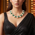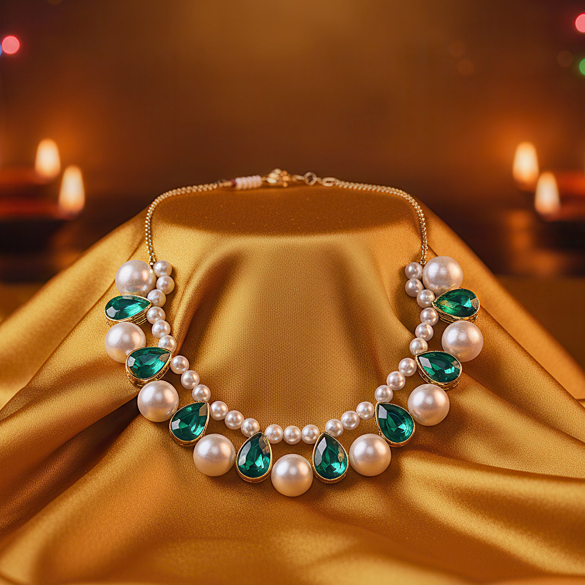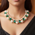 With its magnificent blend of shimmering pearls and brilliant emerald crystals, this stunning display necklace radiates classic sophistication. Each brilliant pearl is expertly set with vivid green stones that sparkle exquisitely, producing an opulent contrast and regal allure. It is the perfect accessory for parties, celebrations, or sophisticated evening attire because of the elaborate design, which gives a bold yet exquisite touch. Its exquisitely detailed and precisely crafted design, which fits comfortably around the neckline, instantly elevates any ensemble with its sophisticated shine. This necklace is ideal for people who value timeless beauty with a contemporary twist because it exudes confidence, style, and elegance. It lends a hint of royal glitz to every ensemble, whether worn alone or with matching earrings.