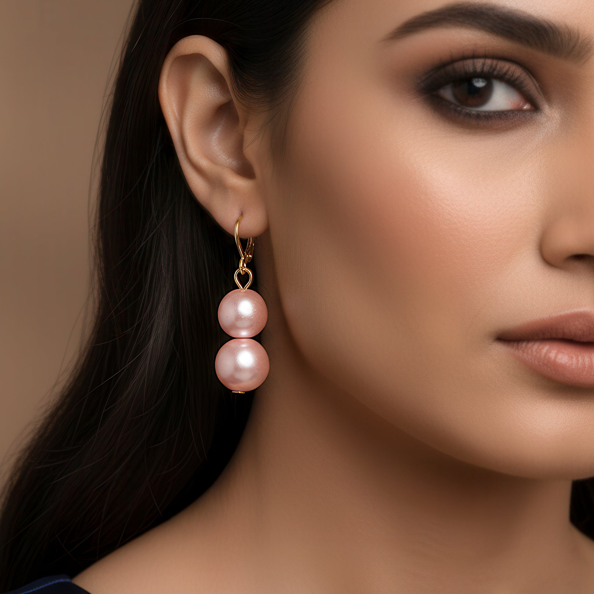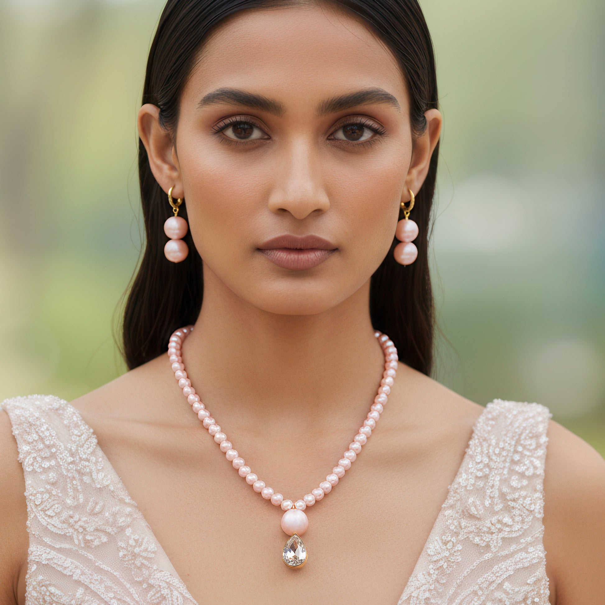With its exquisite blend of rose-pink pearls and glistening crystals set in a deep gold tone, this exquisite jewelry set exudes feminine charm. A delicate yet alluring glow is produced by the necklace's exquisitely placed pearls and sparkling stones, which reflect light with each movement. The combination, when paired with matching earrings, radiates warmth and sophistication and is ideal for weddings, celebrations, and other special occasions. The pearls' delicate pink hue is accentuated by the gold finish, which adds a luxurious yet understated appeal. It easily blends well with both traditional and modern ensembles and is lightweight and pleasant to wear. This classic piece, which was expertly crafted, provides a touch of romanticism and refinement, making it a perfect choice for sophisticated style or gift-giving.