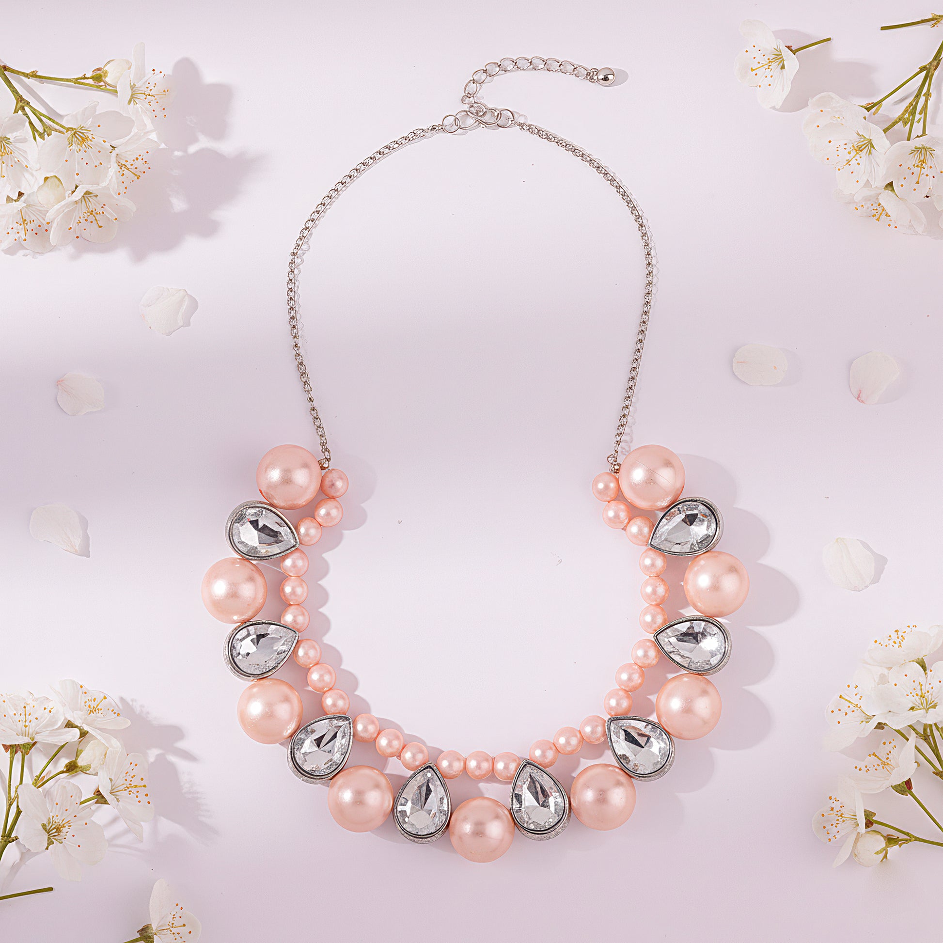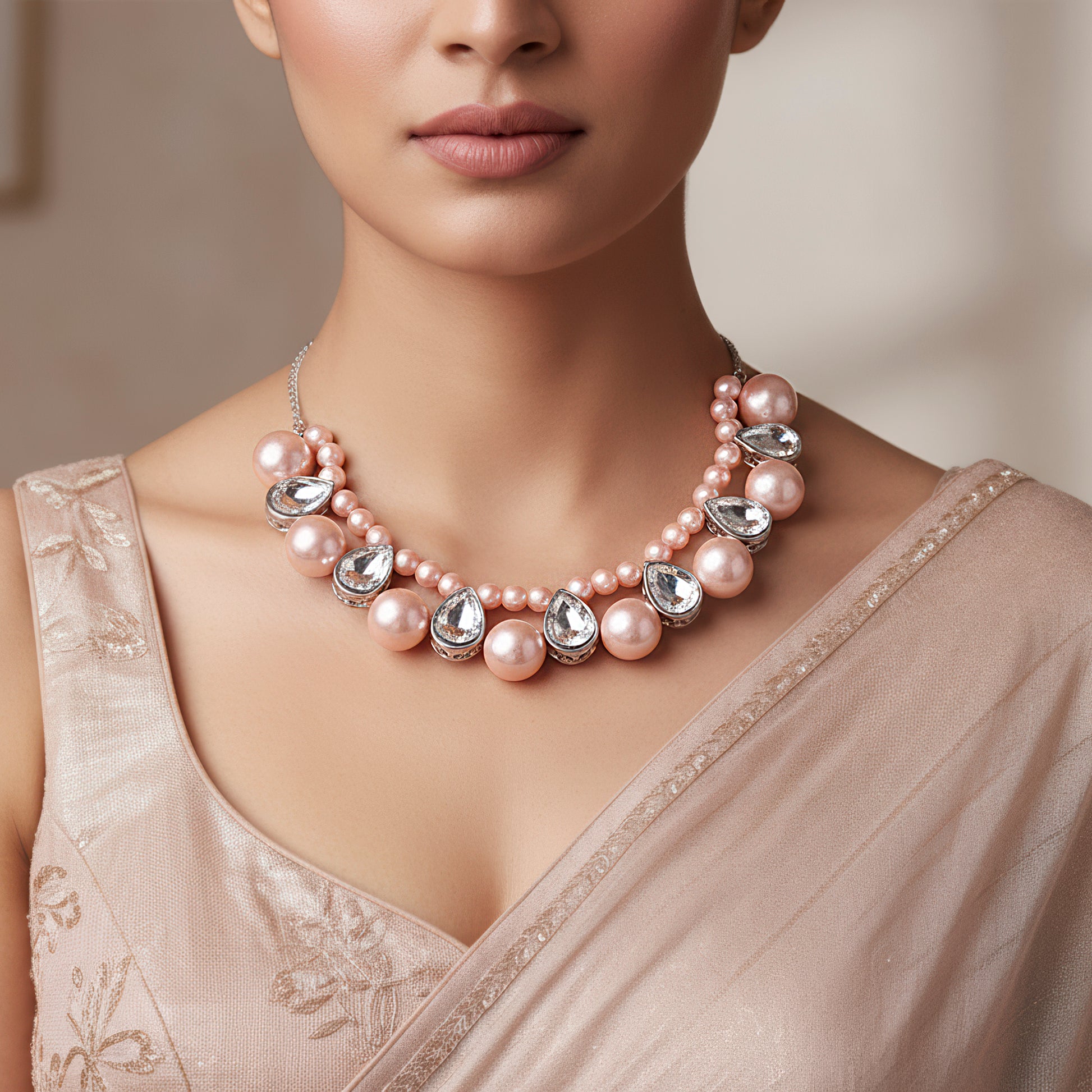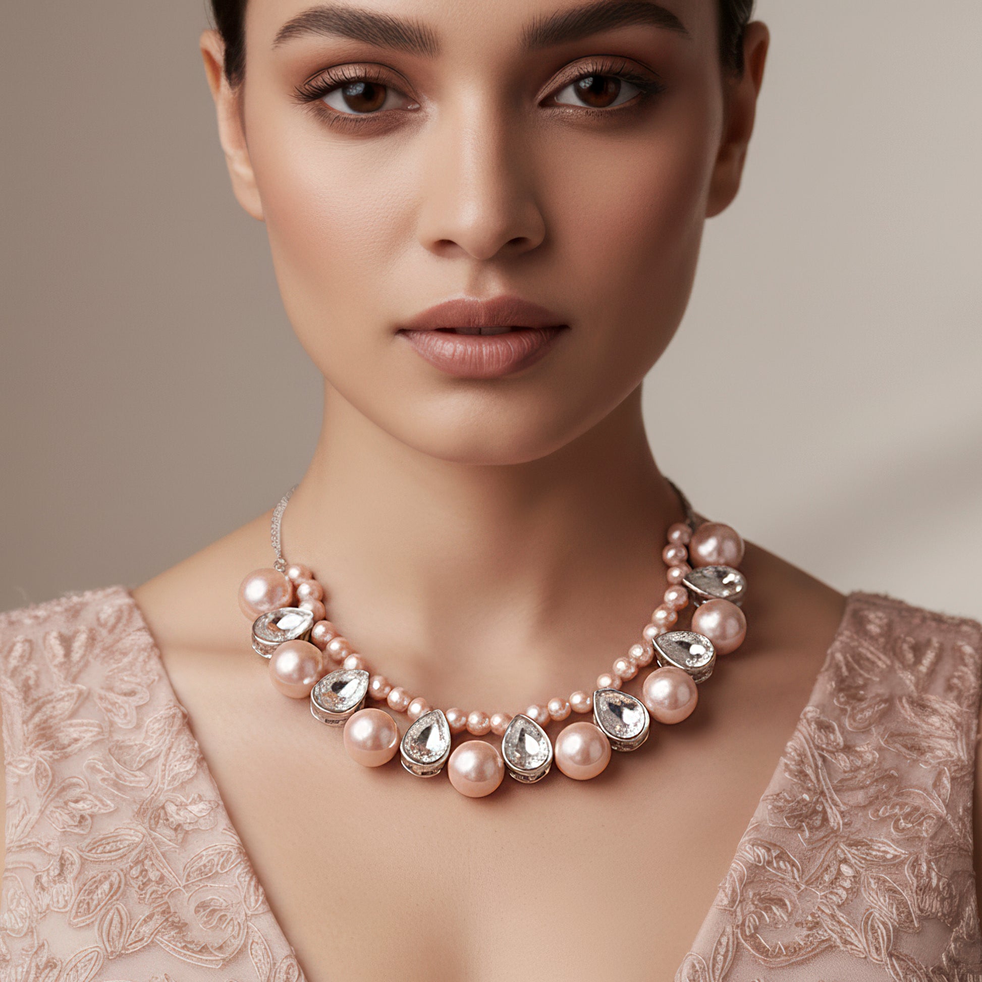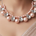 This exquisite necklace strikes the ideal mix between charm and sophistication by showcasing the classic beauty of rose-pink pearls set with sparkling crystals. The glittering crystals offer a brilliant touch that catches the light beautifully, and each pearl is positioned with care to showcase its delicate shine. The pattern is a gorgeous option for special events, joyous festivities, or sophisticated evenings because it radiates femininity and grace. Its exquisite workmanship guarantees comfort and longevity, and the tasteful combination of pink hues and crystal gleam adds an opulent touch to any ensemble. This stunning statement necklace elevates any appearance, whether it is worn with traditional or contemporary clothing.