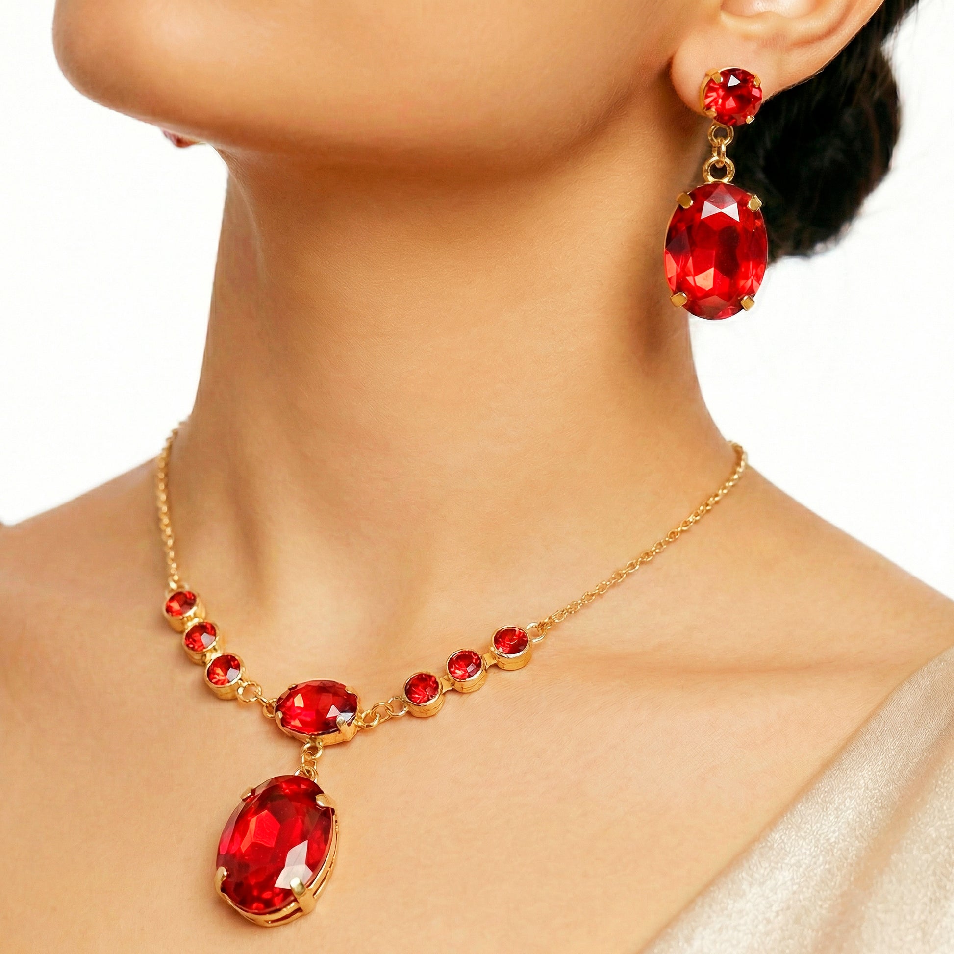 This sophisticated necklace set includes a gorgeous large oval crystal pendant that brilliantly catches the light, making it the focal point of any ensemble. A delicate silver border encircling the pendant adds refinement and highlights its brilliance. With matching earrings, this combination provides the ideal amount of elegance and glitz. It is made to add flair to both formal and informal ensembles, and it looks great with dresses, sarees, or evening gowns. Every neckline may be comfortably fitted by the adjustable chain, and the lightweight construction makes it simple to wear all day. This classic piece instantly adds elegance and beauty to your jewelry collection and is perfect for weddings, parties, and other special occasions.