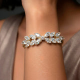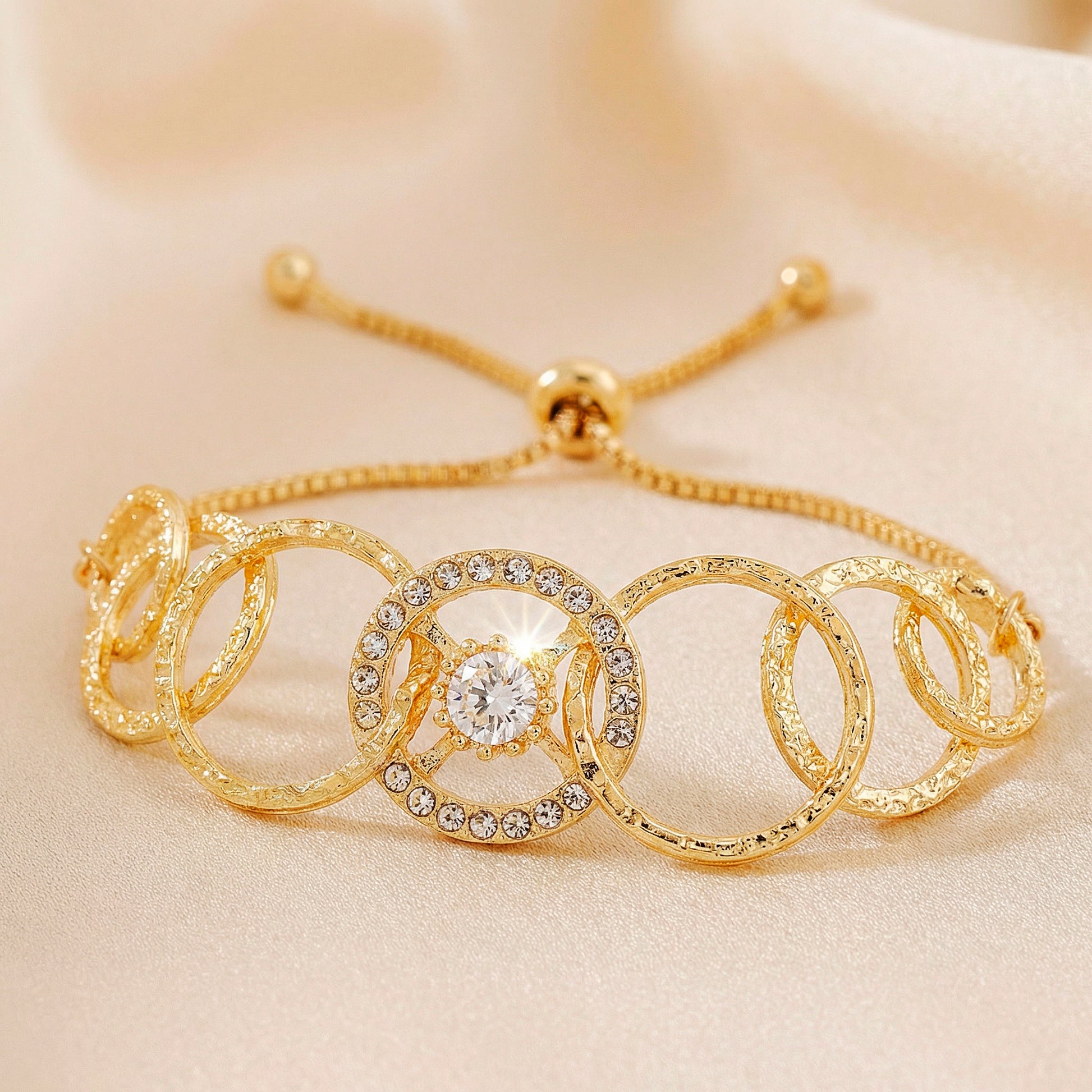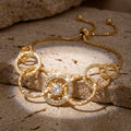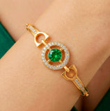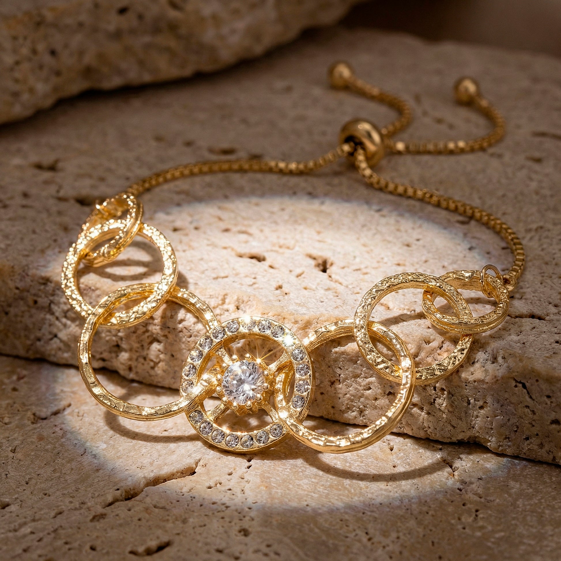 The stunning center circle of this exquisite bracelet is set with glittering ADs. which stand for completeness and beauty. Sleek metallic links connect the central AD circle, resulting in a sophisticated and well-balanced design that combines traditional beauty with contemporary flair. Its chain may be adjusted to fit wrist sizes of various kinds, providing comfort and adaptability. The bright stones brilliantly capture the light, giving your appearance a hint of glitter without being overbearing. This bracelet is ideal for special occasions as well as everyday elegance, and it goes well with festive, business, or casual attire. It is elegant and sophisticated, lightweight, and long-lasting, making it a perfect present for a particular someone or a classic addition to your own jewelry collection.