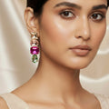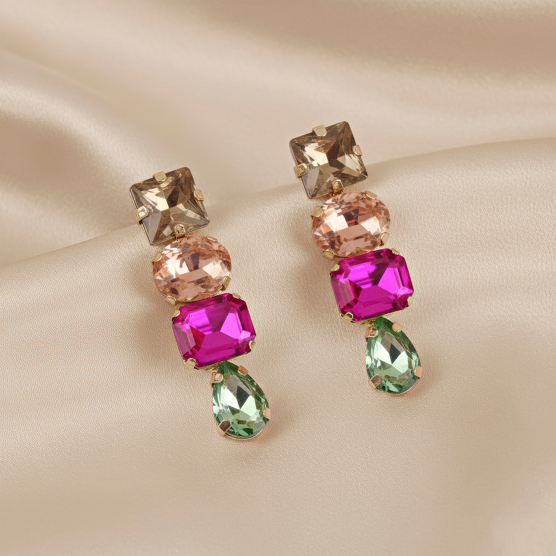 The gorgeous combination of multi-shaped and multi-colored stones in these lengthy earrings makes a stunning statement. Each piece is expertly crafted, showcasing a fusion of vivid colors and distinctive geometric shapes that will enhance your style with charm and refinement. The dangling stones whimsical movement catches the light brilliantly, making them ideal for evening events, celebrations, or bringing some flair to an otherwise basic ensemble. They add beauty and vitality to your appearance while being comfy and lightweight. These earrings are a must-have piece for anyone who like bold, eye-catching jewelry because they add a pop of color, sparkle, and individuality to both traditional and contemporary outfits.