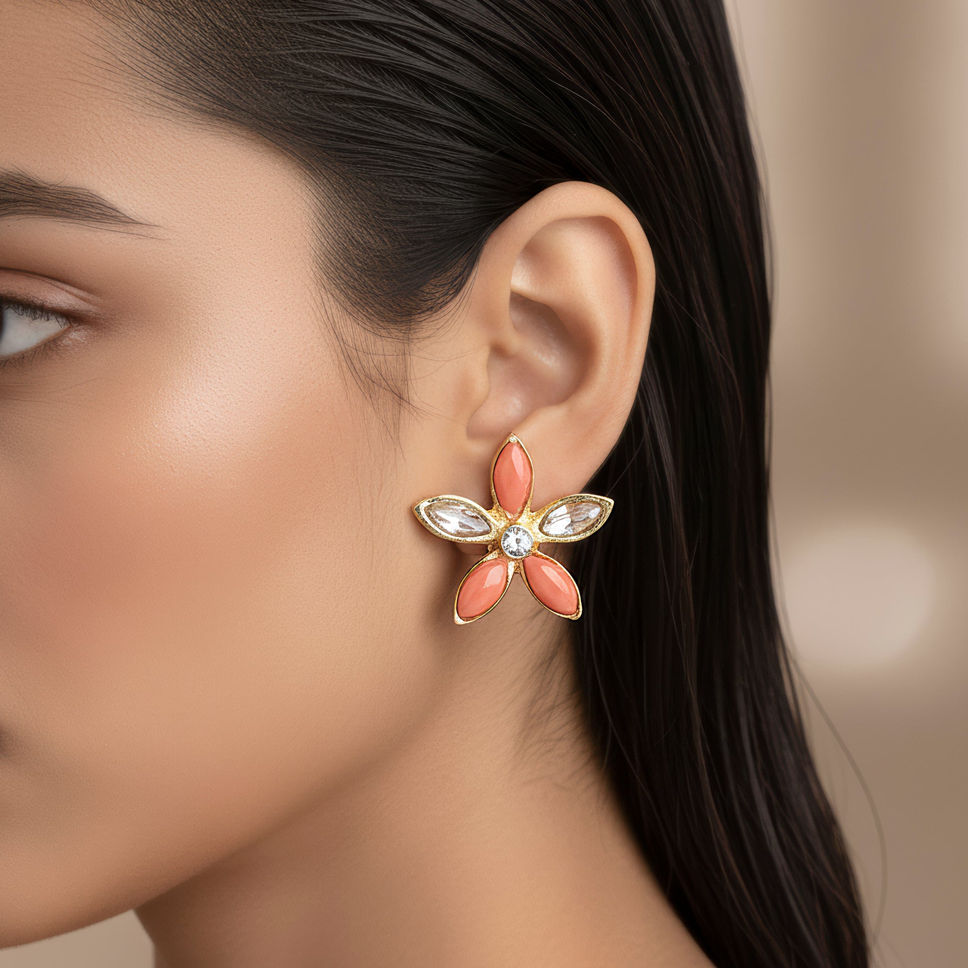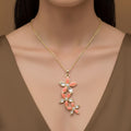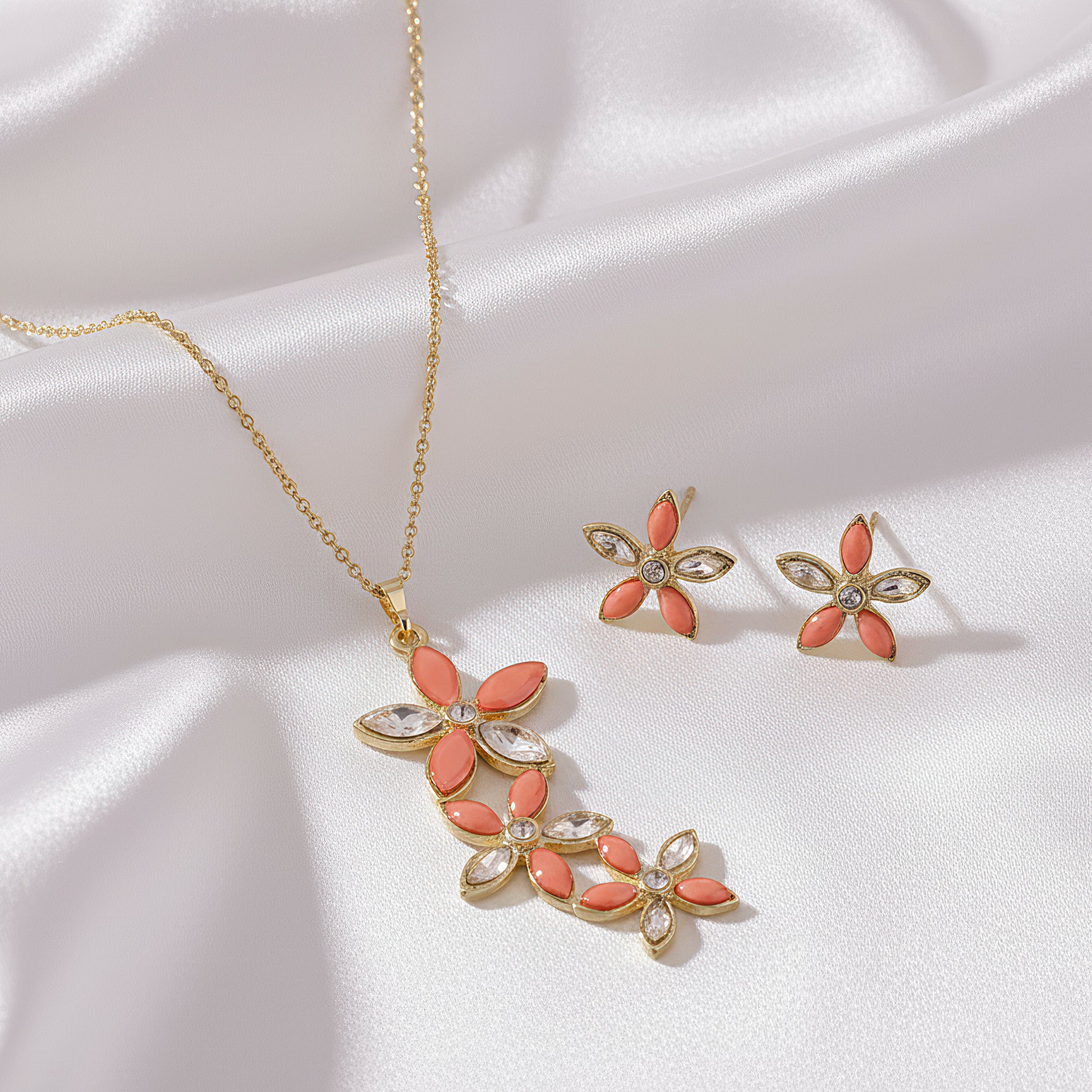 This exquisite pendant combination creates a beautiful and feminine charm by fusing glittering crystals with delicate flower enamel craftsmanship. The pendant's exquisitely designed floral motif is complemented by glistening stones that capture light from every direction. The combination is ideal for both informal and festive situations because its matching earrings reflect the same fine craftsmanship. The crystals provide an opulent touch of brilliance, while the enamel work provides a splash of color and sophistication. This combination adds sophisticated elegance to any ensemble and is lightweight and comfortable to wear. Perfect for presenting or wearing on your own, it exquisitely combines contemporary design with classic flower inspiration, giving your ensemble a bright final touch.