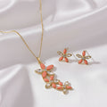PRAO Anti-Tarnish Flower Enamel & Crystal Pendant Necklace Set With Earrings