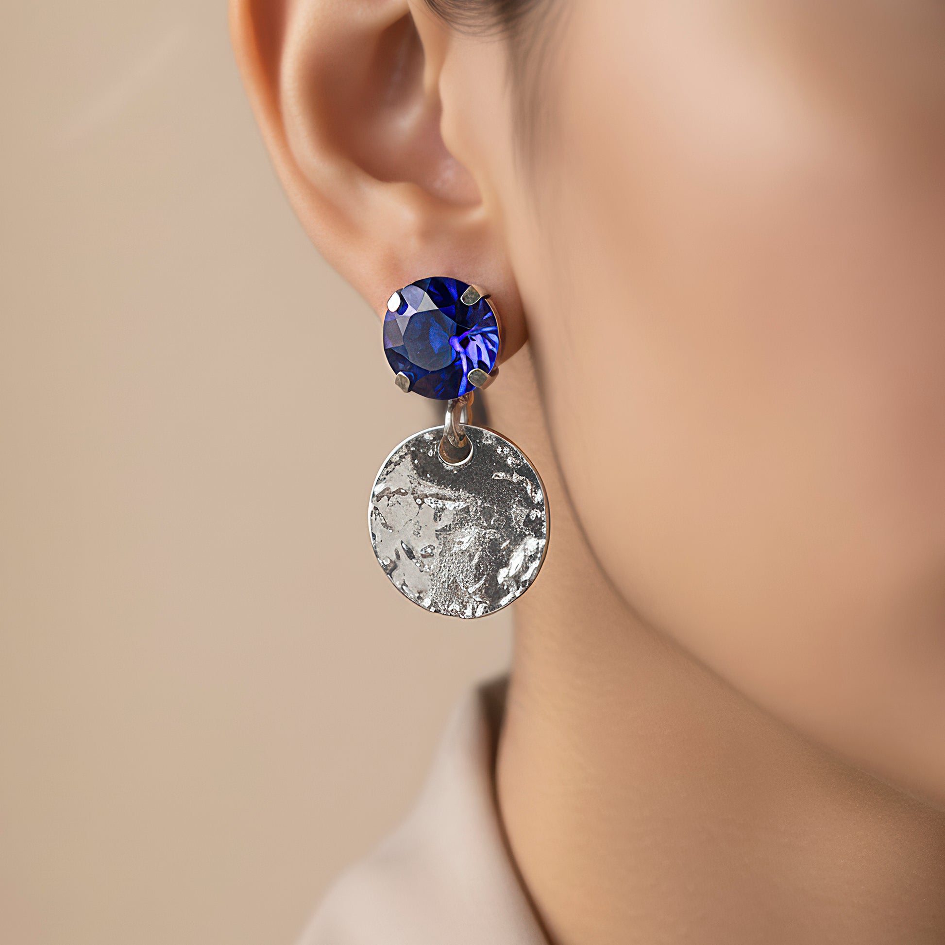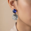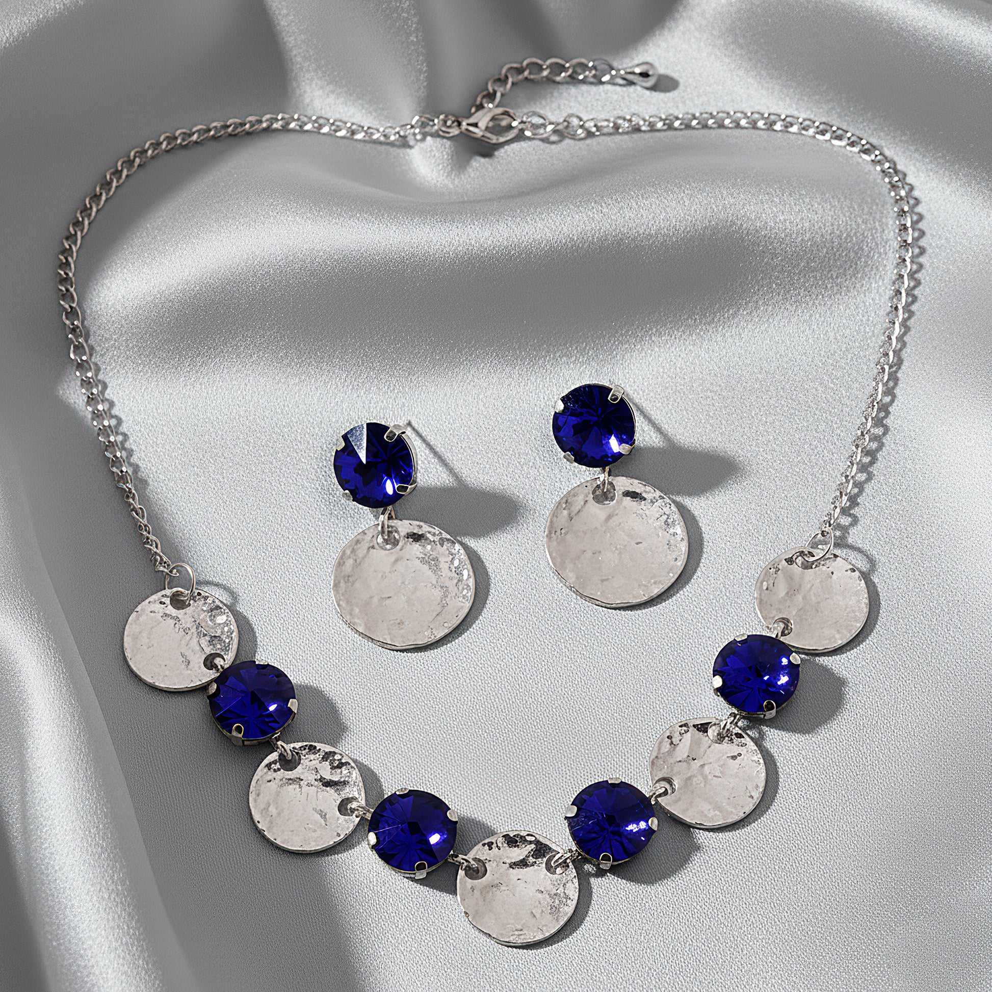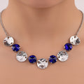 The combination of glittering blue sapphire crystals and hammered silver coins gives this alluring statement necklace a striking and opulent appearance. The rich sapphire tones offer a refined contrast and a touch of royal beauty, while the textured silver coins add a hint of vintage creativity. The necklace, which is made to leave a lasting impression, elegantly falls around the neckline and adds a refined sheen to any ensemble. It blends classic metallic features with gemstone brightness, making it ideal for formal parties, festive celebrations, and nighttime get-togethers. For individuals who value distinctive craftsmanship and sophisticated, eye-catching jewelry, this lightweight yet powerful item enhances your ensemble with depth, color, and elegance.