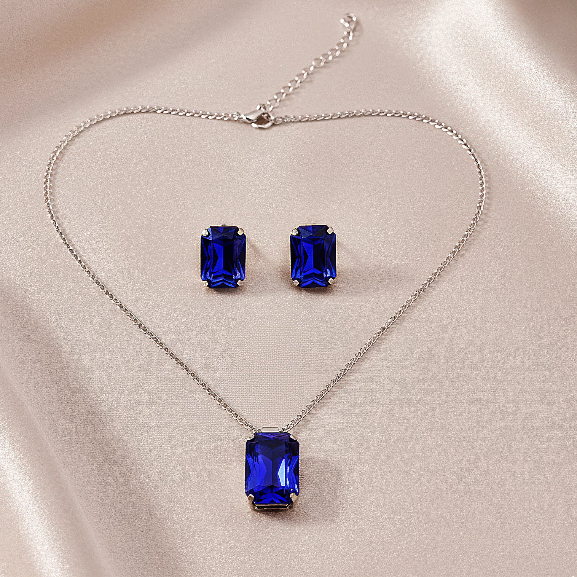 A dazzling blue sapphire crystal set in a sleek silver-tone frame creates a timeless combination of refinement and appeal in this exquisite pendant necklace. The silver finish provides a contemporary, polished touch, while the deep sapphire color elegantly captures light, signifying elegance and tranquility. The pendant, which hangs elegantly from a sophisticated chain and has a simple yet opulent design, is ideal for both special events and daily wear. Its adaptable style adds a subtle glitter and touch of refinement to any ensemble, whether professional or informal. This piece is a must-have accessory for people who value traditional elegance with a modern twist because it is lightweight, comfortable to wear, and exudes subtle luxury and refined beauty.