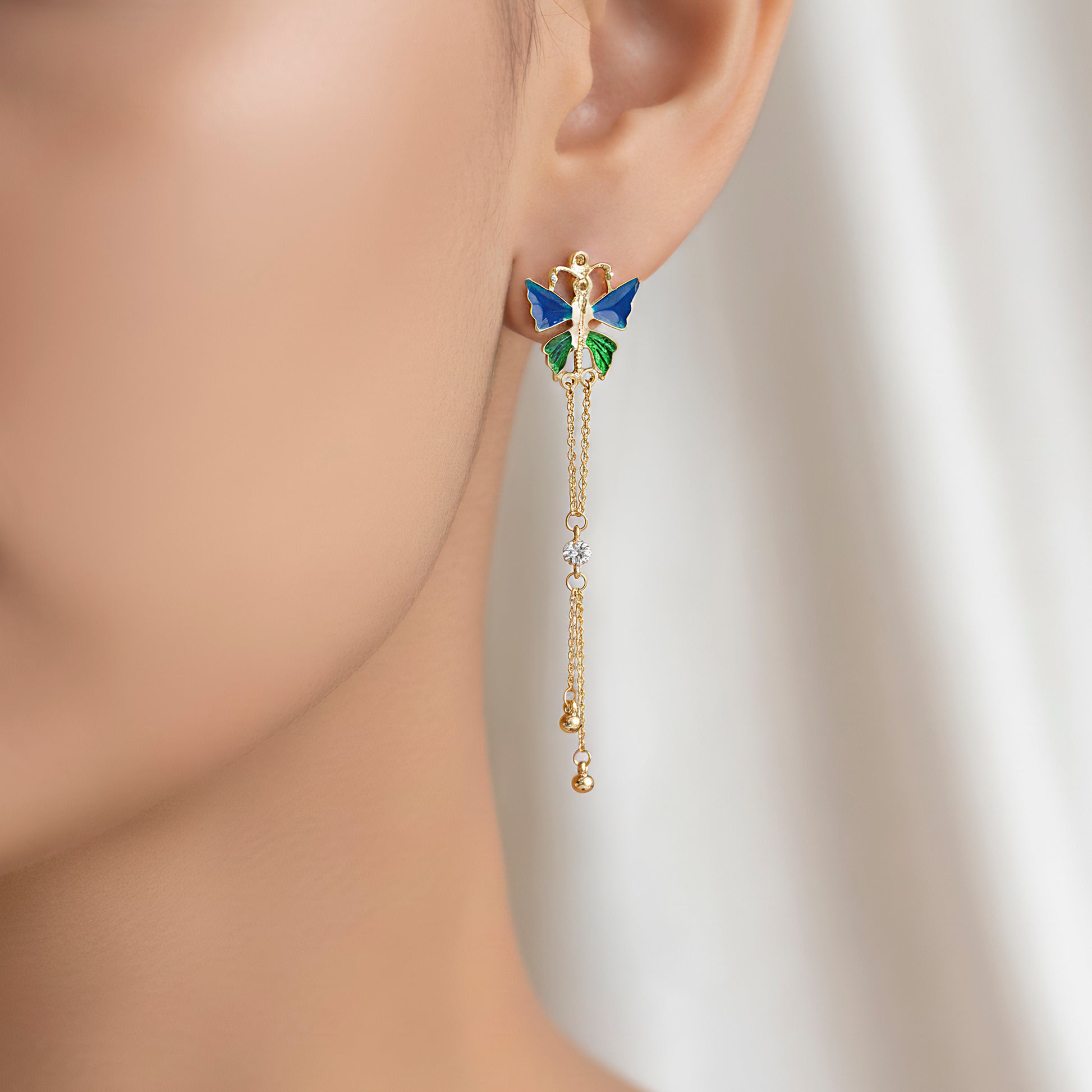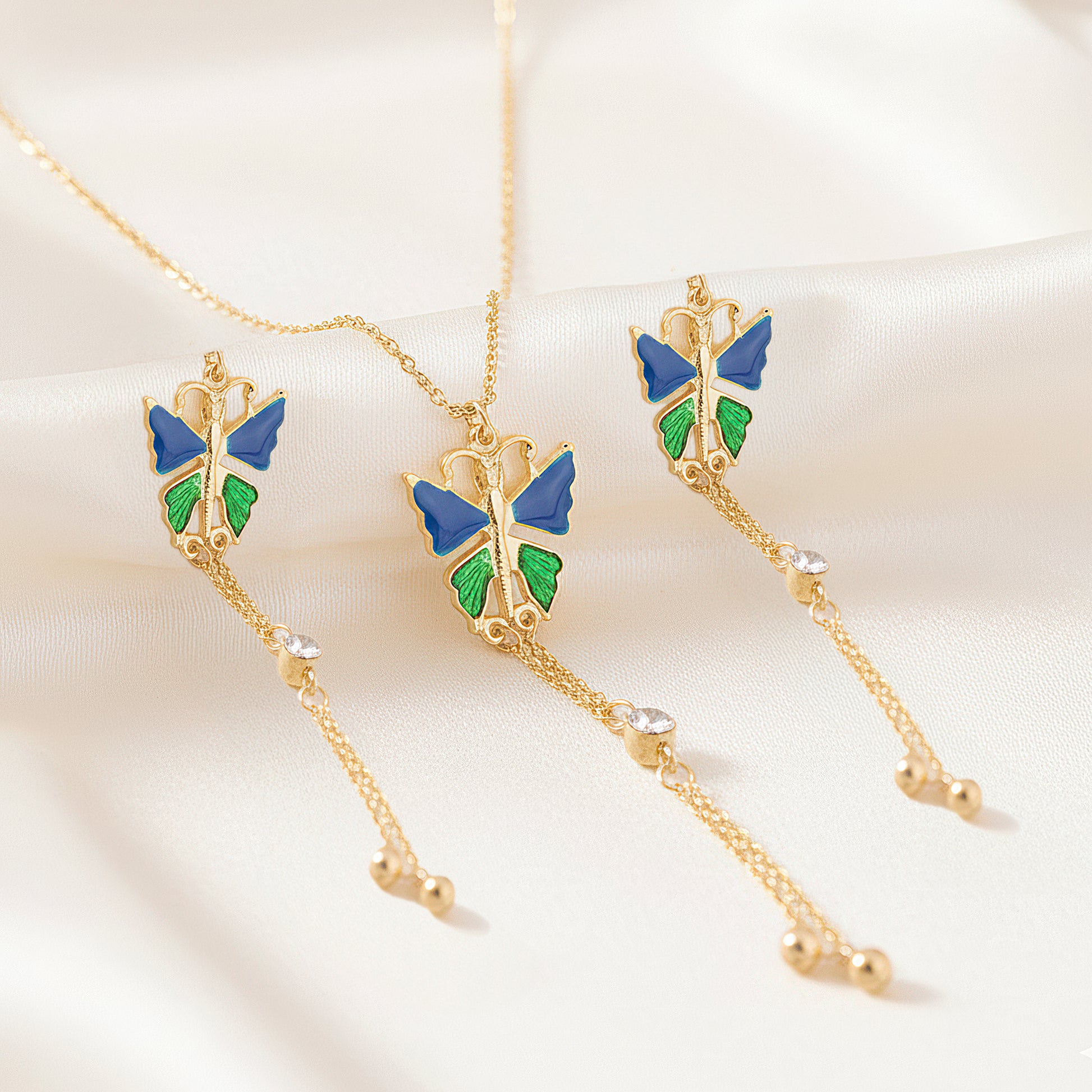 Delicately sculpted enamel butterflies with glittering embellishments add a touch of elegance and charm to this captivating lariat necklace set. A delicate, feminine silhouette is produced by the elegant lariat-style pattern that falls lovely along the neckline. Each butterfly has exquisite enamel details in vivid colors, giving it a whimsical yet elegant appearance. The necklace and matching earrings are a wonderful fit, adding harmony and subtle shine to the entire ensemble. This ensemble is fashionable and lightweight, making it ideal for both special evening events and everyday excursions. It is the perfect option for people who want distinctive, striking jewelry that represents metamorphosis, liberation, and classic elegance since it skillfully combines nature-inspired beauty with a contemporary style.