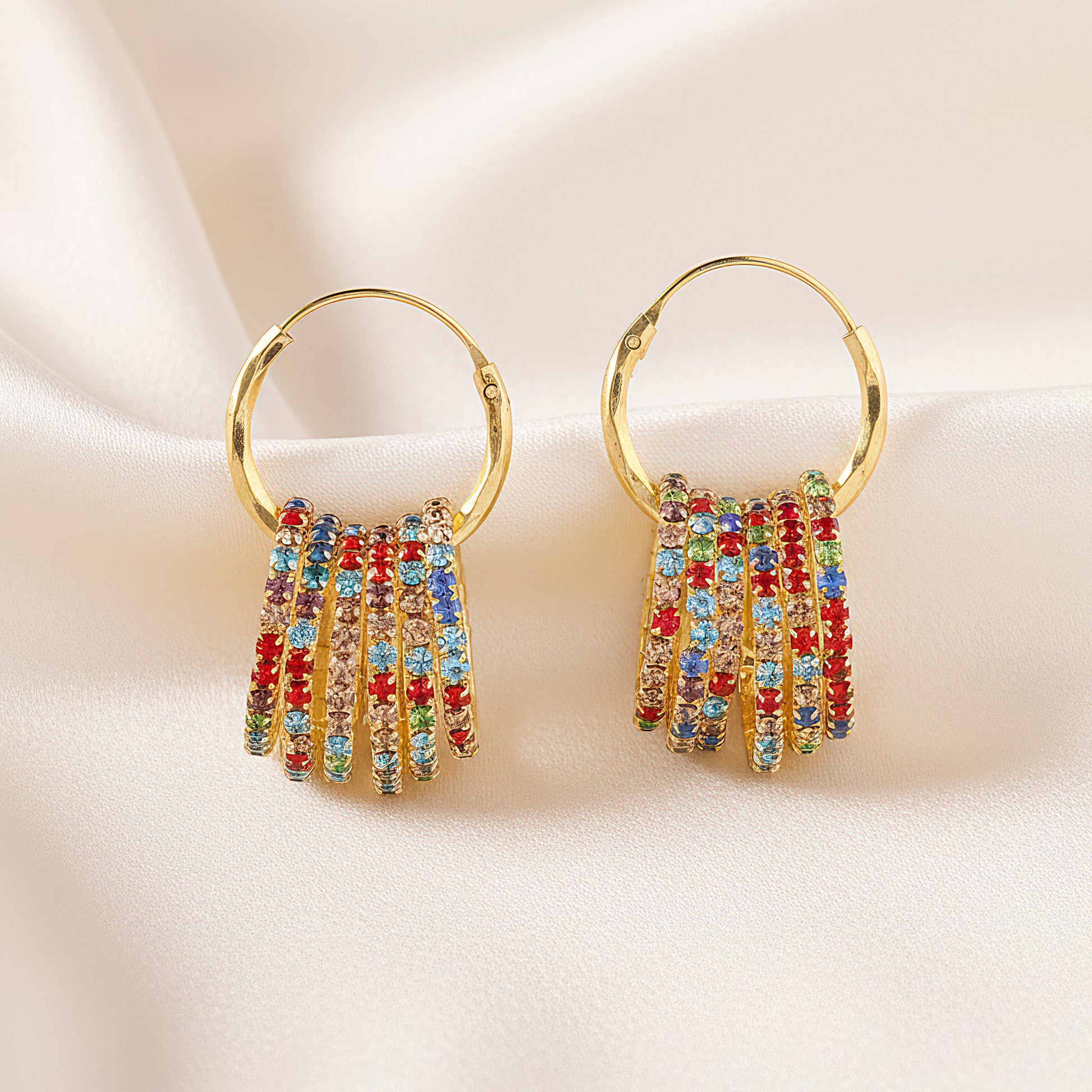 These gorgeous multilayered hoop earrings are embellished with a variety of brilliant crystals that catch light from every direction. A rich, multifaceted appearance that radiates glitz and refinement is produced by each layer's exquisite craftsmanship. These hoops are the ideal statement item for any event because of the multi-crystal detailing, which provides brilliance and texture. Bold and lightweight, they add effortless shine to your ensemble while being pleasant to wear. These earrings add a stylish and contemporary accent to your look, whether they are worn with an evening gown or casual clothing. They represent classic beauty with a modern twist, making them ideal for anyone who enjoy a blend of sophistication and edge.