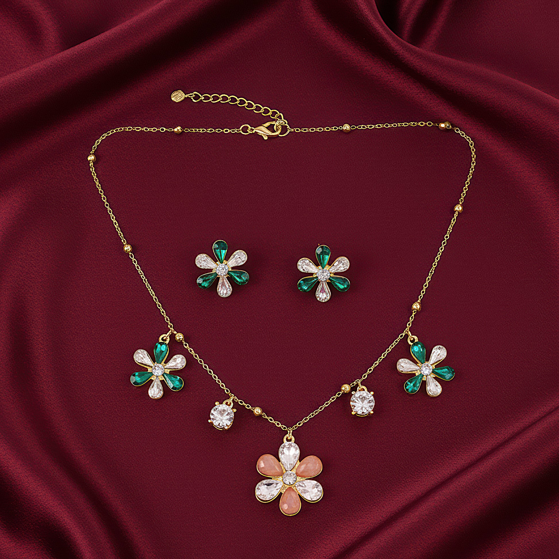 This gorgeous jewelry set includes matching earrings with sparkling crystal flower charms and an elegant chain necklace. Every floral pattern gleams exquisitely, reflecting light from all directions to produce a sophisticated and brilliant image. The crystal blossoms provide a touch of softness and charm, while the delicate chain adds a sophisticated touch. This combination adds effortless sophistication to any ensemble, making it ideal for both formal events and daily use. The lightweight and cozy earrings go well with the classic style of the necklace. This jewelry set adds shine and elegance to any ensemble, whether it's worn for a romantic evening, a celebratory event, or as a thoughtful gift. A must-have item that combines contemporary elegance with traditional charm.