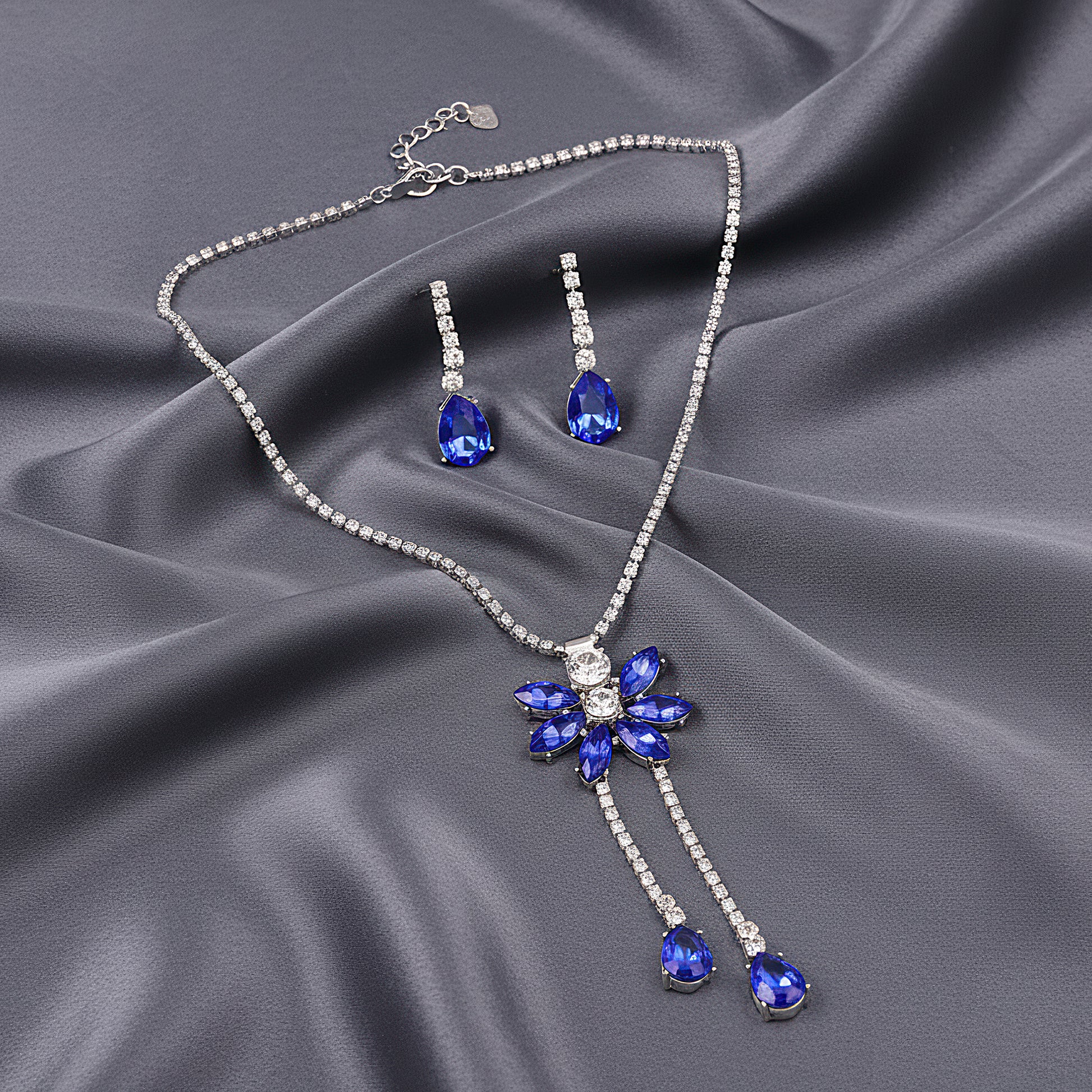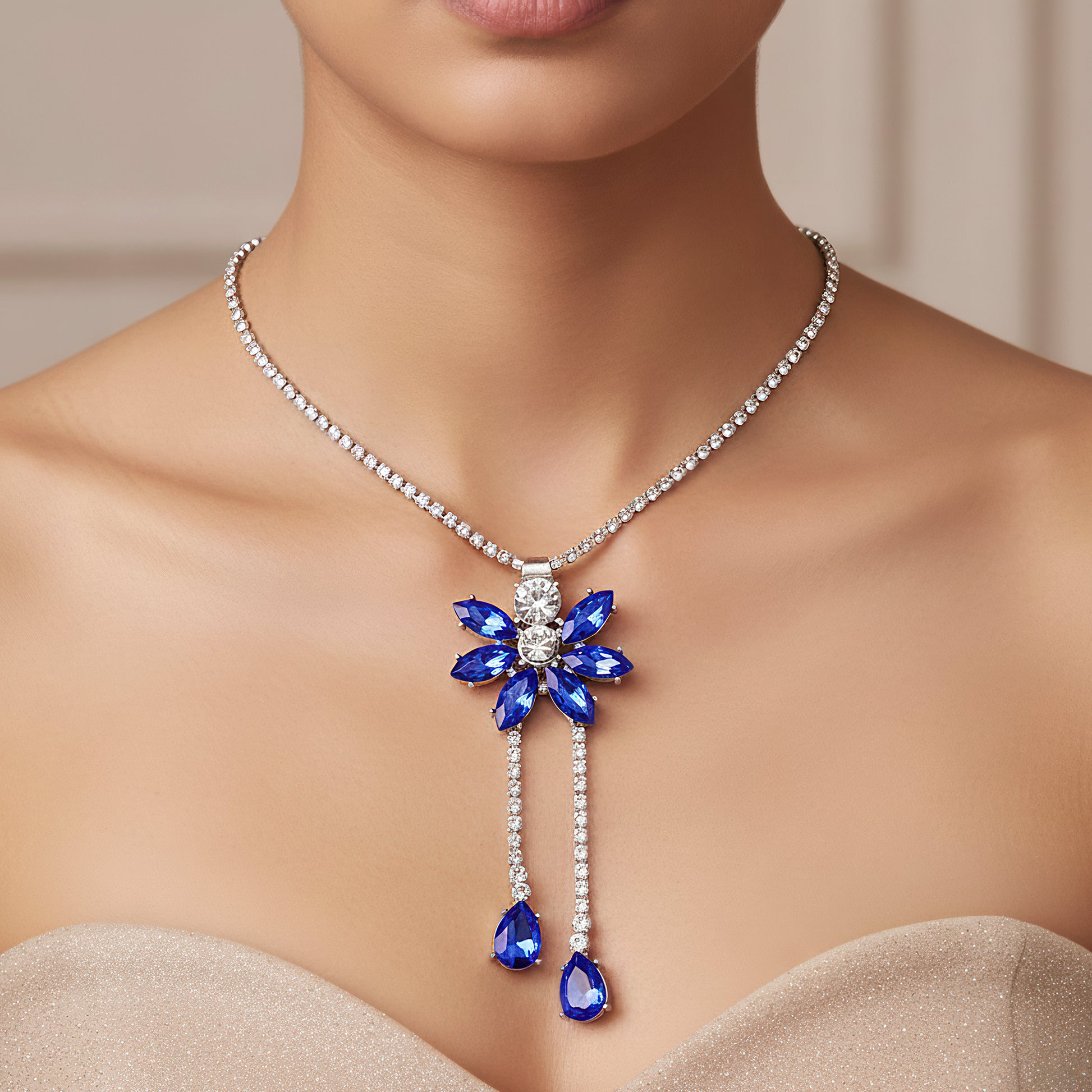 The rhinestone chain lariat necklace and matching earrings in this gorgeous jewelry set are intended to lend a little of glitz and refinement to any ensemble. The necklace has a delicate floral pendant adorned with glistening rhinestones that sparkle exquisitely with each movement. Its lariat-style design offers a sleek, contemporary touch, lengthening the neckline with a lovely drop effect. The combination is harmoniously completed with matching earrings that reflect the same floral glitter. This set is perfect for weddings, parties, or evening gatherings because it is lightweight and visually appealing. It adds sparkle and grace to any ensemble and is designed to showcase both modern style and timeless charm. An exquisite piece of jewelry that exudes refinement, femininity, and grace.