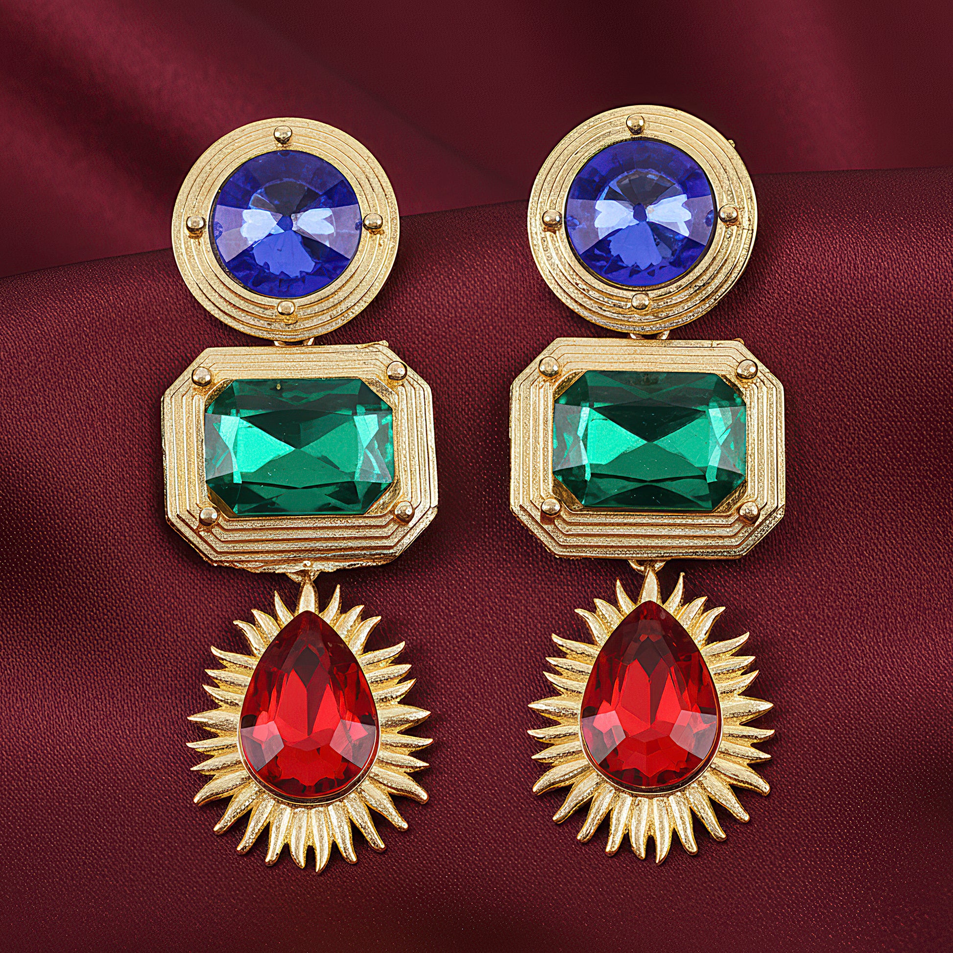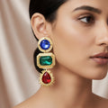 The unique combination of multi-shaped gems in these stunning dangling earrings shimmers exquisitely with each movement. A harmonious fusion of sparkle, color, and elegance is created by painstakingly cutting and arranging each crystal. These earrings are ideal for celebrations, weddings, and parties because of their cascading shape, which provides elegant motion. They are meticulously crafted and blend classic charm with contemporary sophistication. They are comfy and lightweight, adding a glamorous touch without being bulky. Every angle of light is captured by the sparkling crystals, giving your appearance a beautiful glow. These earrings are a must-have for everyone who enjoys sophisticated shine and statement-making elegance. They are perfect for enhancing both casual and formal ensembles.