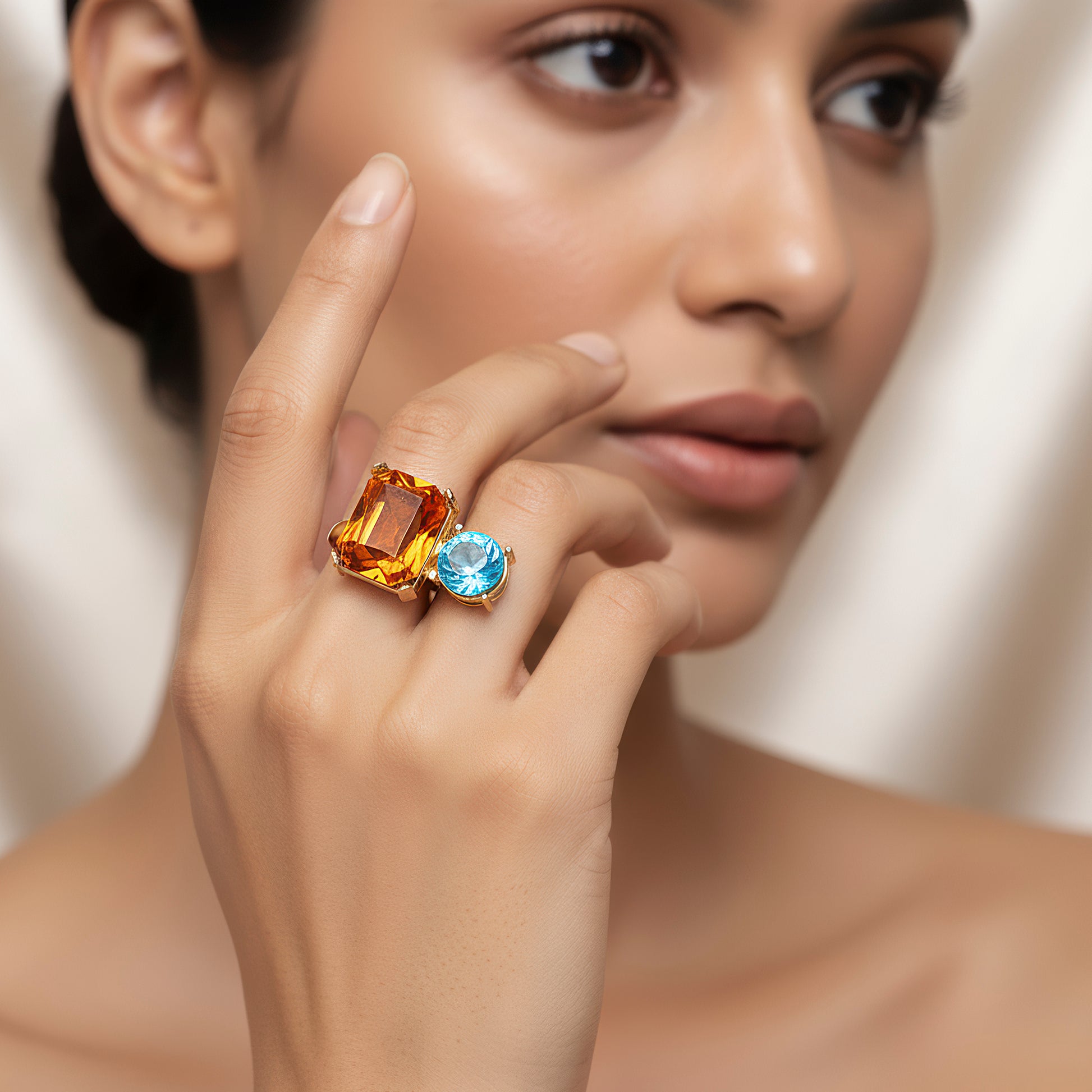 This exquisite ring has a gorgeous arrangement of round and rectangular stones that perfectly mix refinement and glitter. Every crystal is expertly carved to reflect light wonderfully, giving your appearance a bright touch. This ring is a flexible accessory for any occasion because of the contrasting shapes that give a traditional design a contemporary touch. Because of its meticulous construction, it is comfortable and long-lasting for daily use. It adds grace and elegance to your look whether worn alone as a statement piece or combined with other jewelry. This crystal ring enhances any ensemble with classic elegance and sophisticated brilliance, making it perfect for parties, special occasions, or everyday glitz.