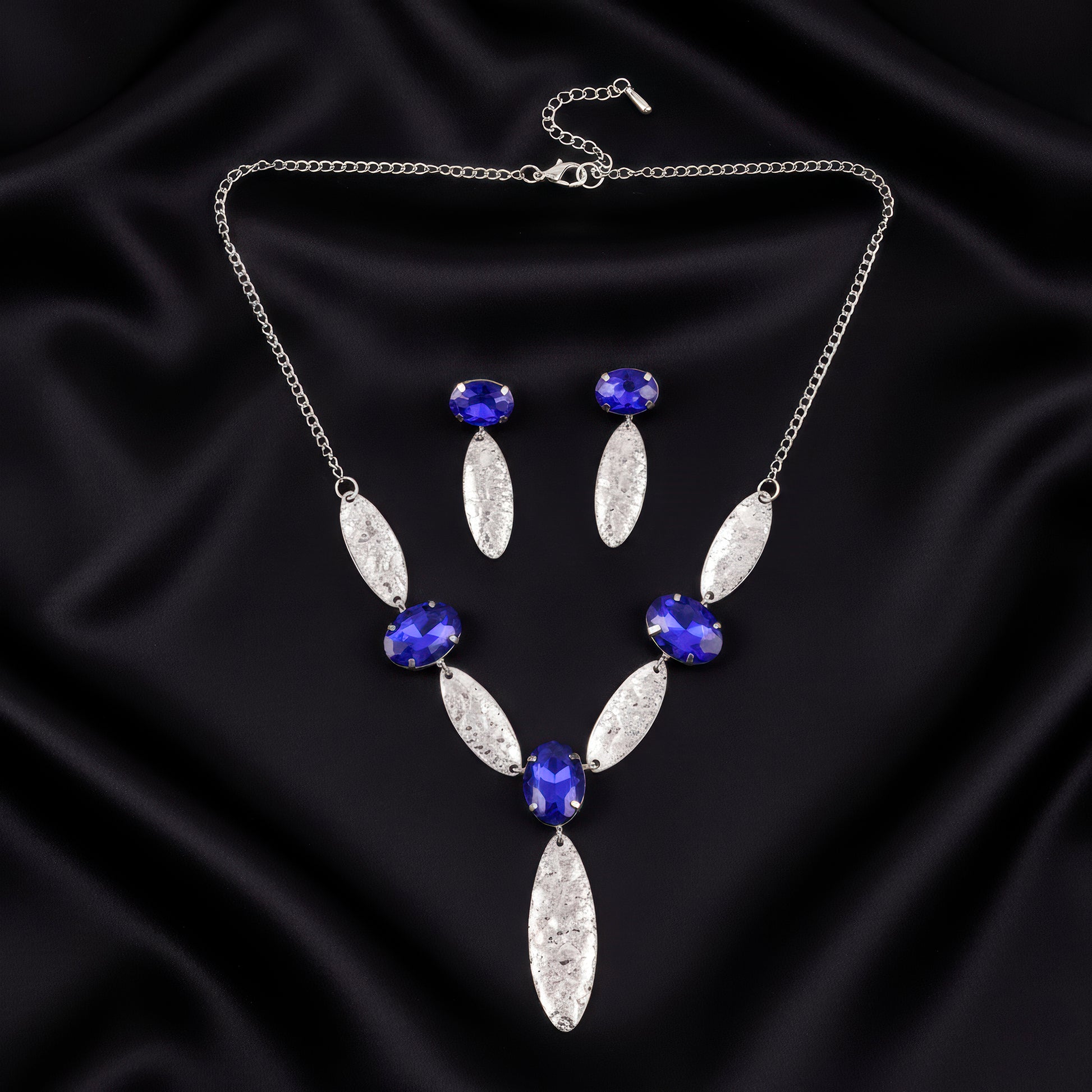 The captivating beauty of blue sapphire gems set in a sophisticated silver tone is displayed in this gorgeous statement necklace. Its striking arrangement of glittering stones, which exude sophistication and elegance, is meant to grab attention. The gems' rich blue tones provide a stunning contrast with the silver base, giving it an opulent and classic appearance. In order to optimize brilliance, each crystal is meticulously carved, reflecting light with each motion. This necklace gives any ensemble a regal touch, making it ideal for formal occasions or nighttime wear. It enhances a confident and elegant appearance whether worn with a traditional dress or a contemporary outfit, making it an essential piece of clothing for people who enjoy making a statement.
