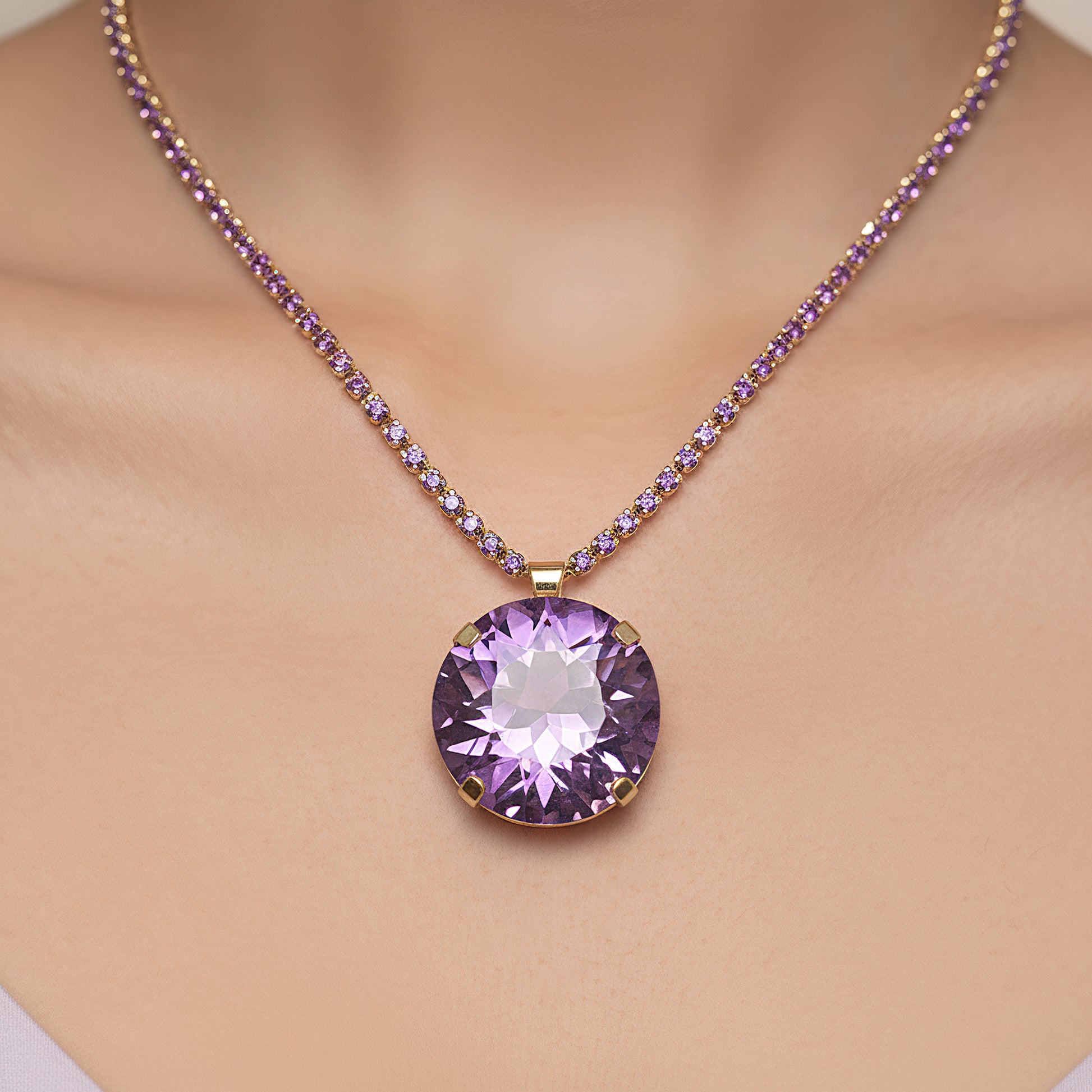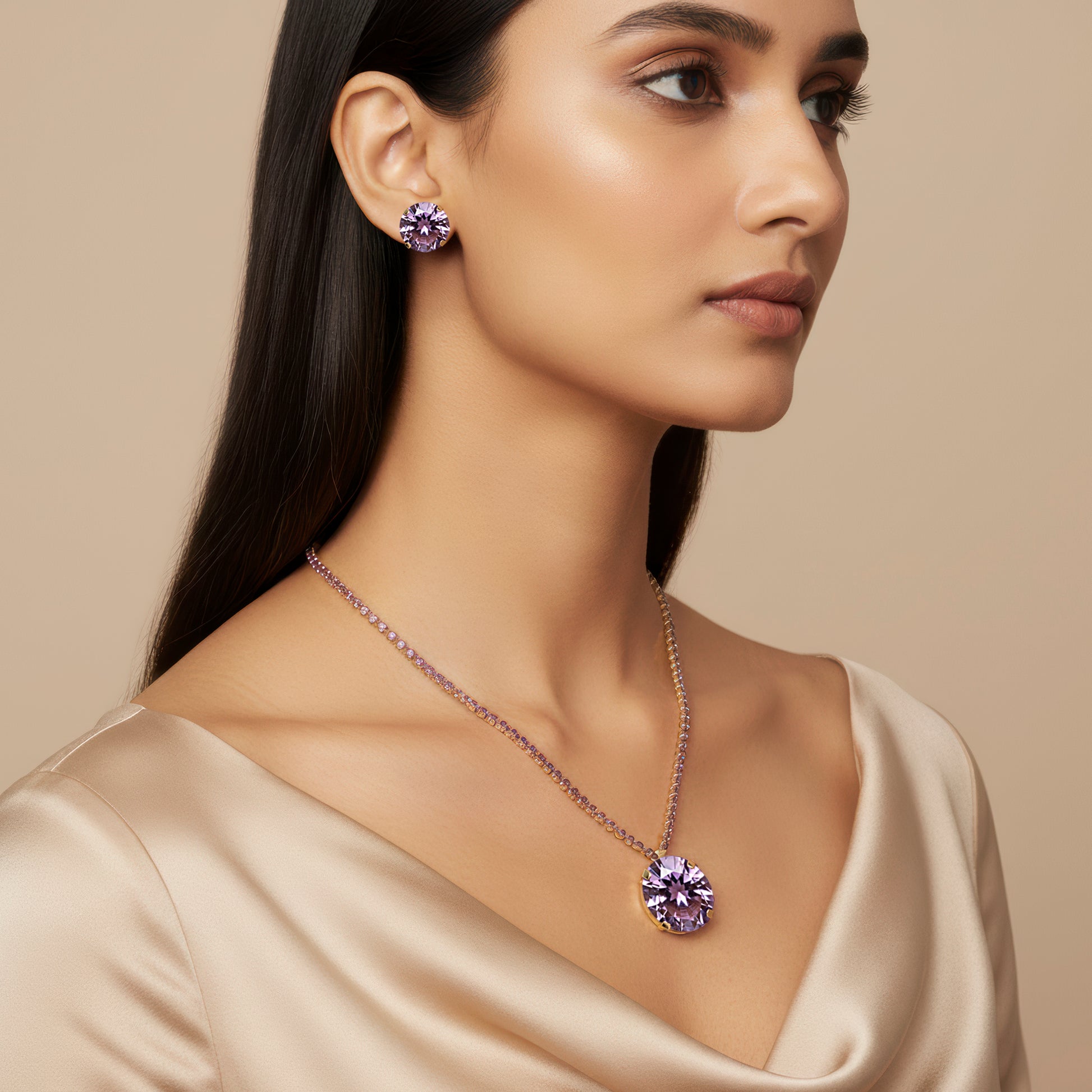 With its large round Tanzanite purple crystal pendant, this gorgeous necklace and earring combination radiates sophistication and elegance. The crystal's rich violet color exudes an opulent beauty and captures light from all sides for a captivating shine. The pendant's regal charm and further brilliance are enhanced by its elegant suspension from a sparkling rhinestone chain. The ensemble is finished with matching earrings that frame your face in a sophisticated way. This set looks great with both traditional and modern attire, making it ideal for evening parties, joyous festivities, or special occasions. It is a stunning option for people who enjoy statement jewelry that exudes confidence and sophistication because of its rich hue, high-shine luster, and classic craftsmanship.