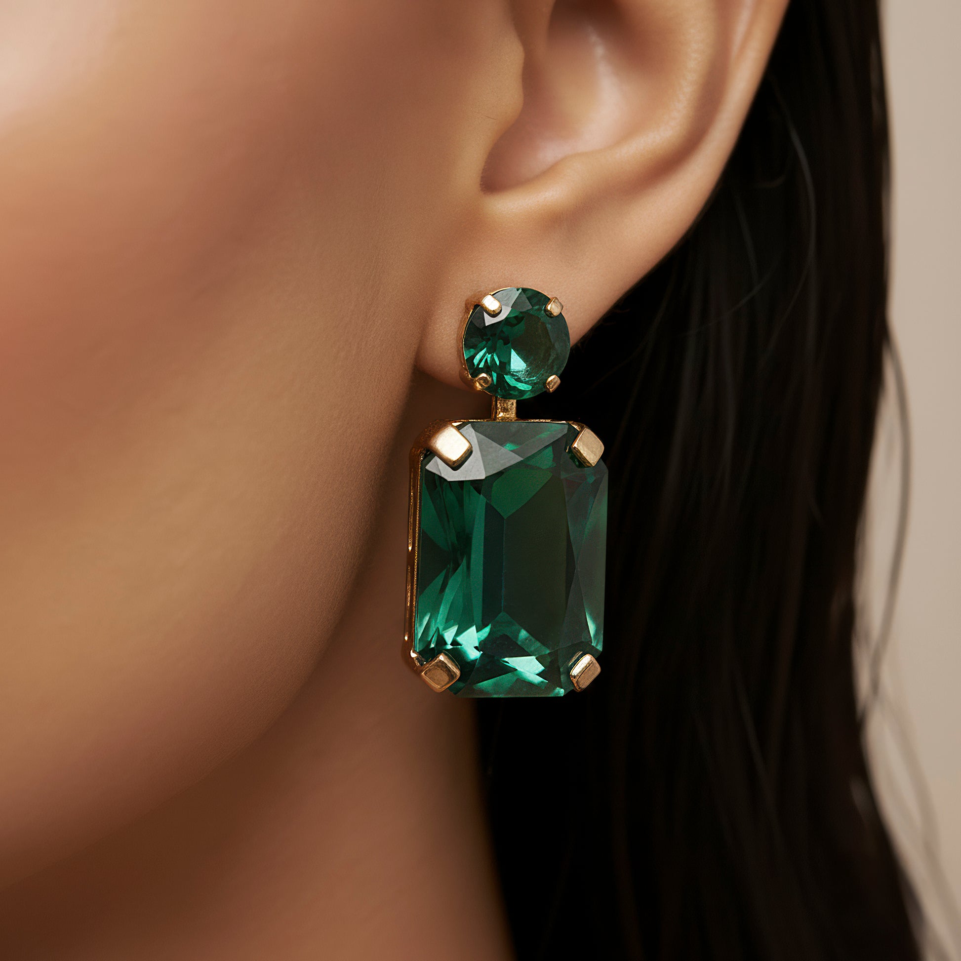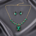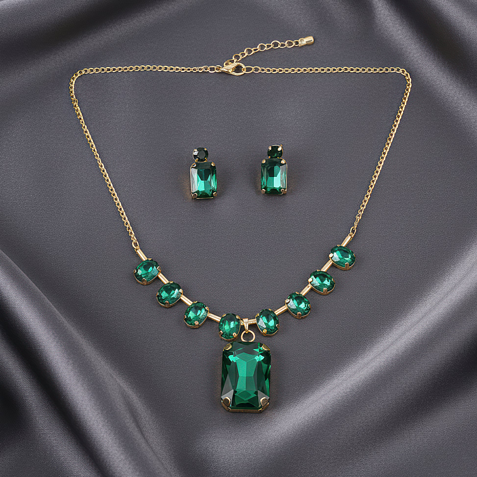 Elegance and sophistication are beautifully combined in this gorgeous necklace set. It has an eye-catching rectangular large crystal pendant in the middle, which is nicely balanced by spacer-set oval emerald gems that exude a rich, opulent radiance. The pendant creates an eye-catching focal point and exquisitely reflects light for a stunning effect. The necklace is complemented with matching earrings, which elegantly finish the ensemble. This set goes well with both classic and contemporary outfits, making it perfect for celebrations, parties, or sophisticated evenings. The vivid green color is a great option for people who enjoy jewelry that stands out with a bold yet elegant appeal since it represents luxury and timeless beauty.