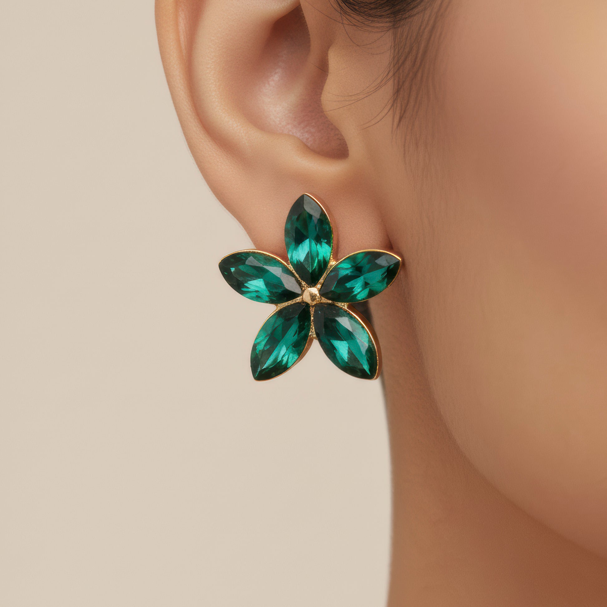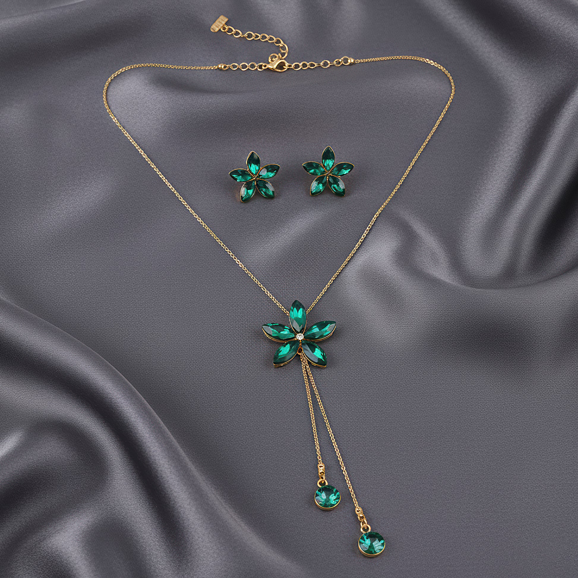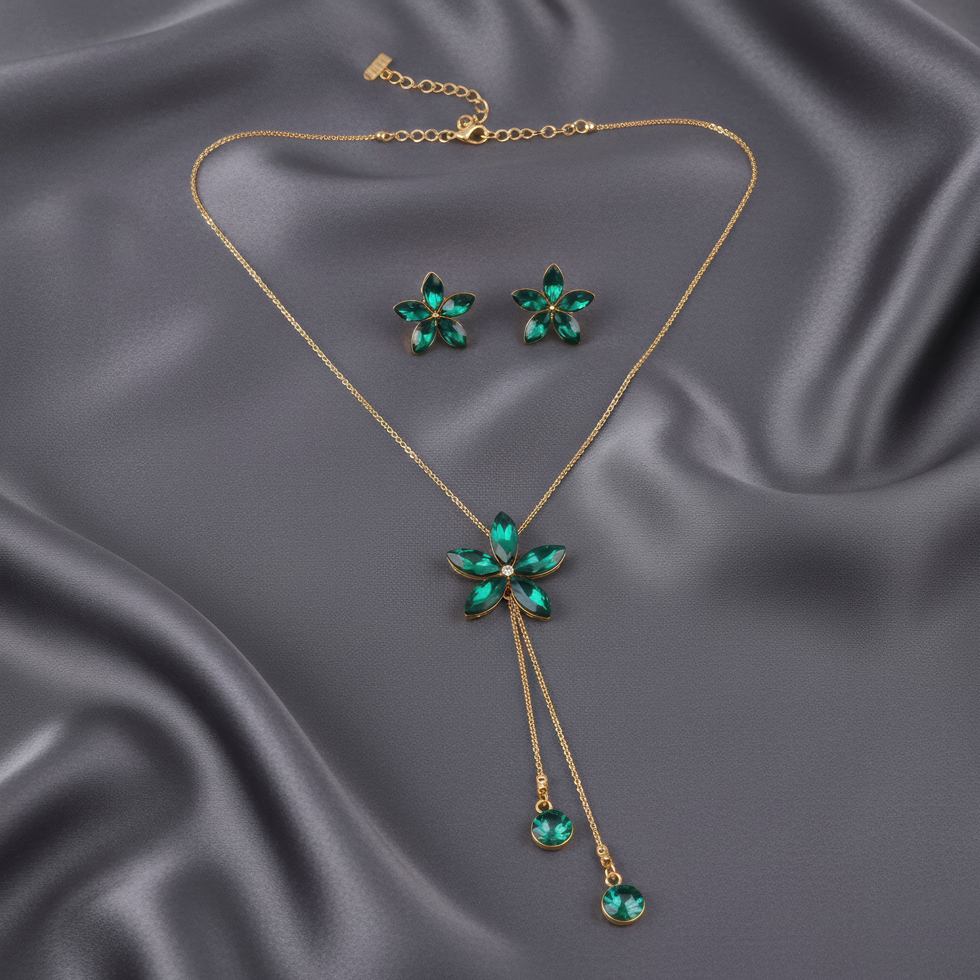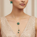 With its exquisite gold finish and glistening emerald gems, this elegant Y-shaped necklace epitomizes everlasting beauty. Each petal is studded with rich green crystals that exude a stunning brilliance, and the design contains delicate flower designs that are expertly made. The Y-shaped drop lengthens the neckline for a sophisticated and feminine appearance. This necklace looks well with both ethnic and western attire, making it ideal for celebrations, weddings, or sophisticated evenings. It is a flexible statement piece for any jewelry collection because of its elegant appeal created by the harmonic blend of emerald and gold tones. Wear it to add a subtle yet memorable sparkle to your charm and style.