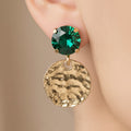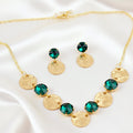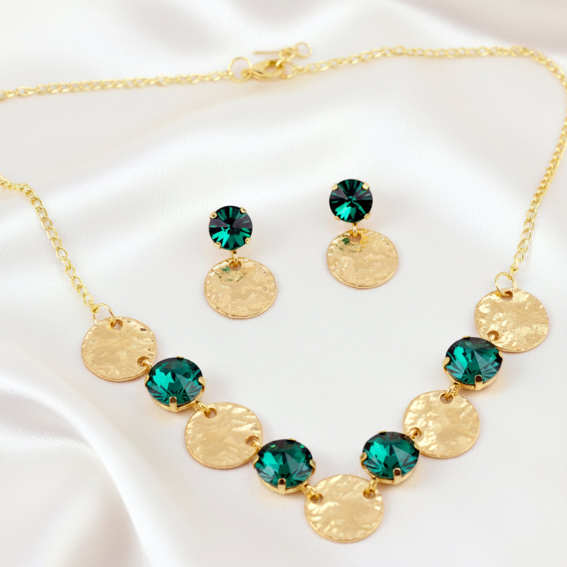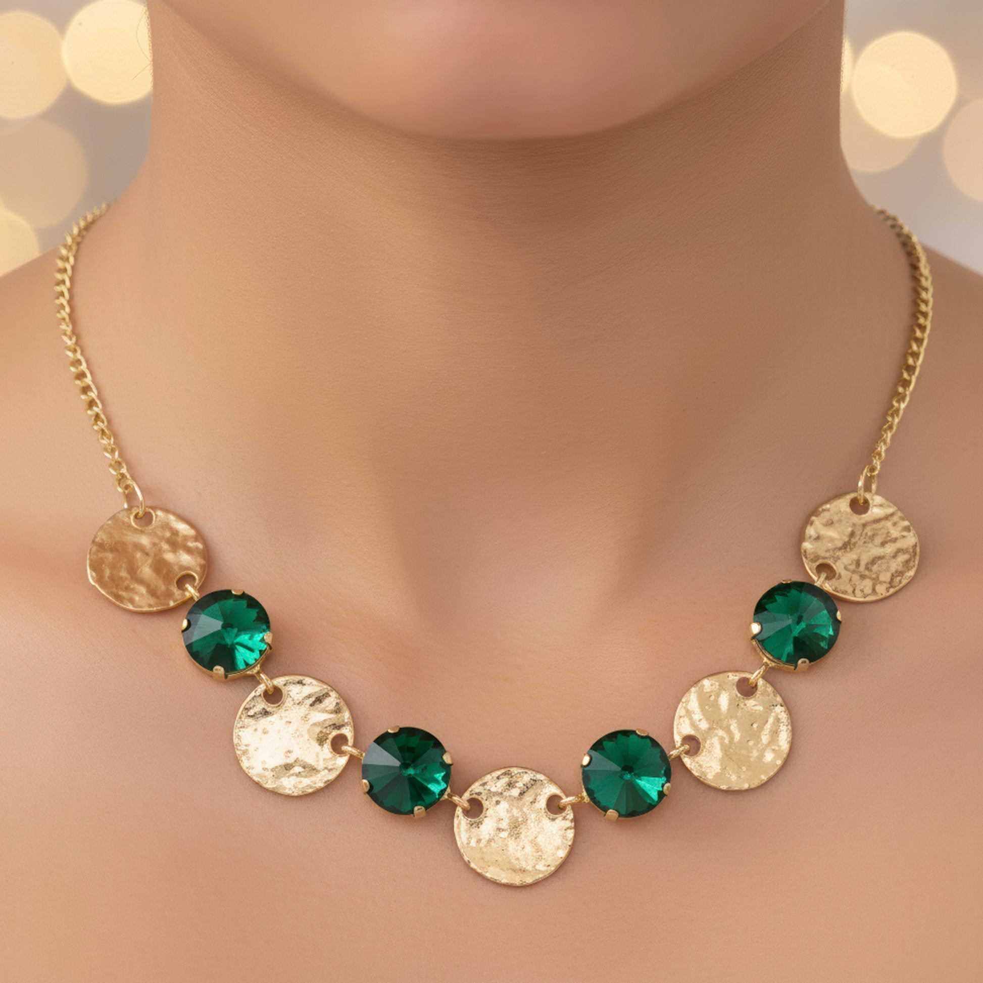 This hammered coin emerald crystal statement necklace instantly elevates any ensemble with its remarkable fusion of traditional charm and contemporary elegance. Rich emerald-toned crystals add depth and a regal touch to the necklace's delicately textured coin-inspired motifs that catch the light beautifully. A striking yet well-balanced pattern is produced by painstakingly cutting each crystal to increase brilliance. The arrangement is ideal for special occasions, celebratory attire, or enhancing regular ensembles because it sits elegantly along the neckline. It is an easy centerpiece because of its opulent atmosphere and striking embellishments. It is lightweight, pleasant to wear, and has a sophisticated appearance that easily blends with both modern and classic styles.