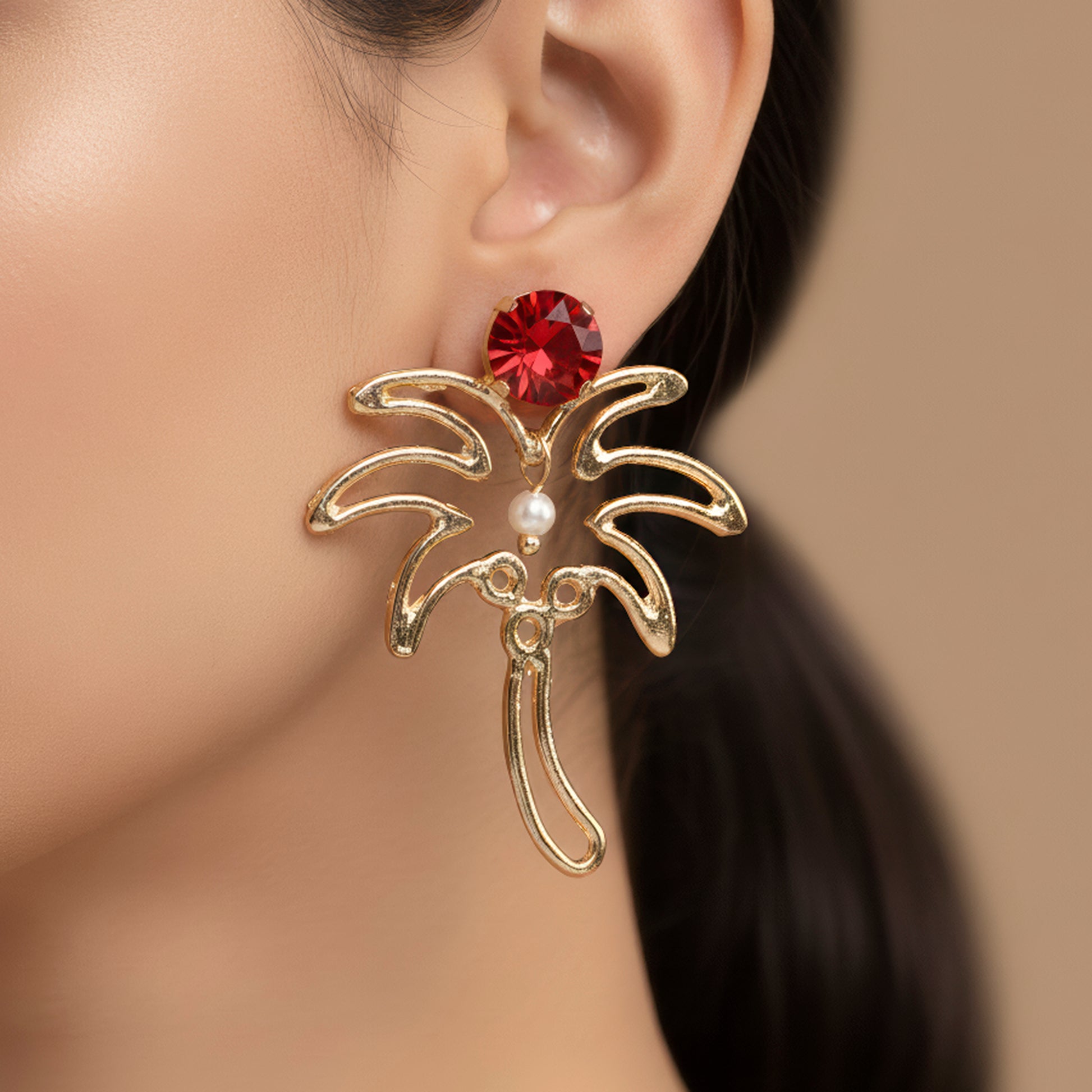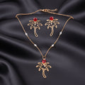 This rose gold with red crystal palm tree necklace set provides a whimsical yet sophisticated touch to any ensemble and is designed to bring a refreshing tropical charm. In contrast to the warm rose-gold finish, the necklaces exquisitely wrought palm tree motif is highlighted by glittering red crystals. Its elegant appearance is enhanced by the delicate chain, which makes it ideal for both special events and informal fashion. The combination has a unified and refined appearance when paired with matching earrings that reflect the same glittering palm design. It simply brightens your neckline and adds a touch of vacation-inspired elegance. It's lightweight and comfortable. This adorable combination is perfect as a present or to add a playful, fashionable touch to your own jewelry collection.