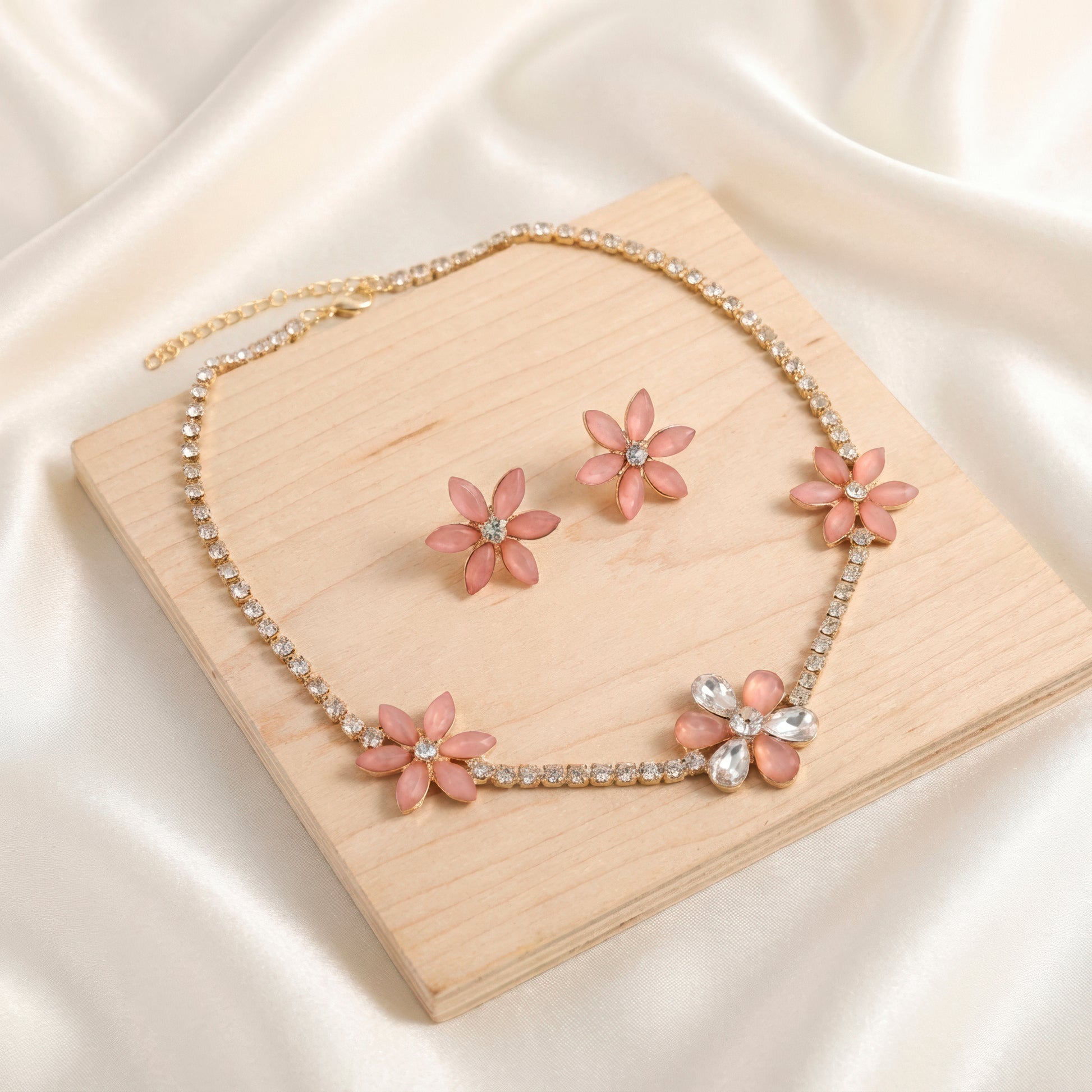 A delicate arrangement of glittering rhinestones cut into flowing floral designs is featured in this exquisite necklace and earring set. Each sparkling petal is highlighted by the necklace's elegant chain, which drapes elegantly down the neckline and produces a gentle, luminous glow with each movement. It is appropriate for celebrations, parties, weddings, and evening gatherings because of its lightweight construction, which guarantees pleasant wear for extended periods of time. The identical floral charm is reflected in the matching earrings, which give your entire ensemble a hint of well-balanced refinement. When combined, the set enhances both traditional and modern attire with the ideal balance of shine and femininity. This item elegantly completes your appearance with grace and adds a classic brilliance to any jewelry collection, whether it is worn personally or given as a gift.