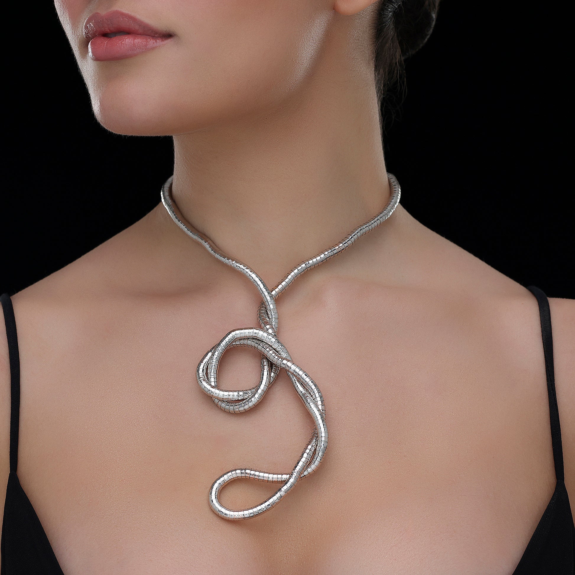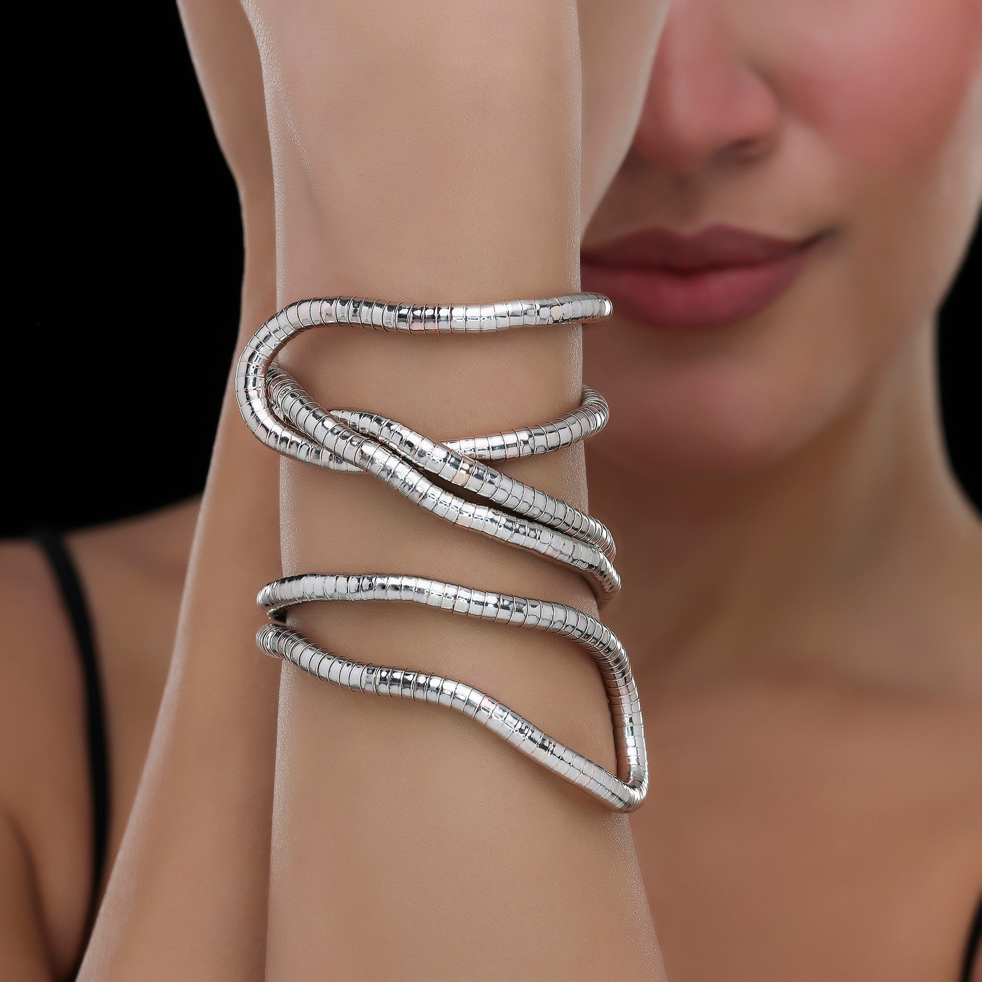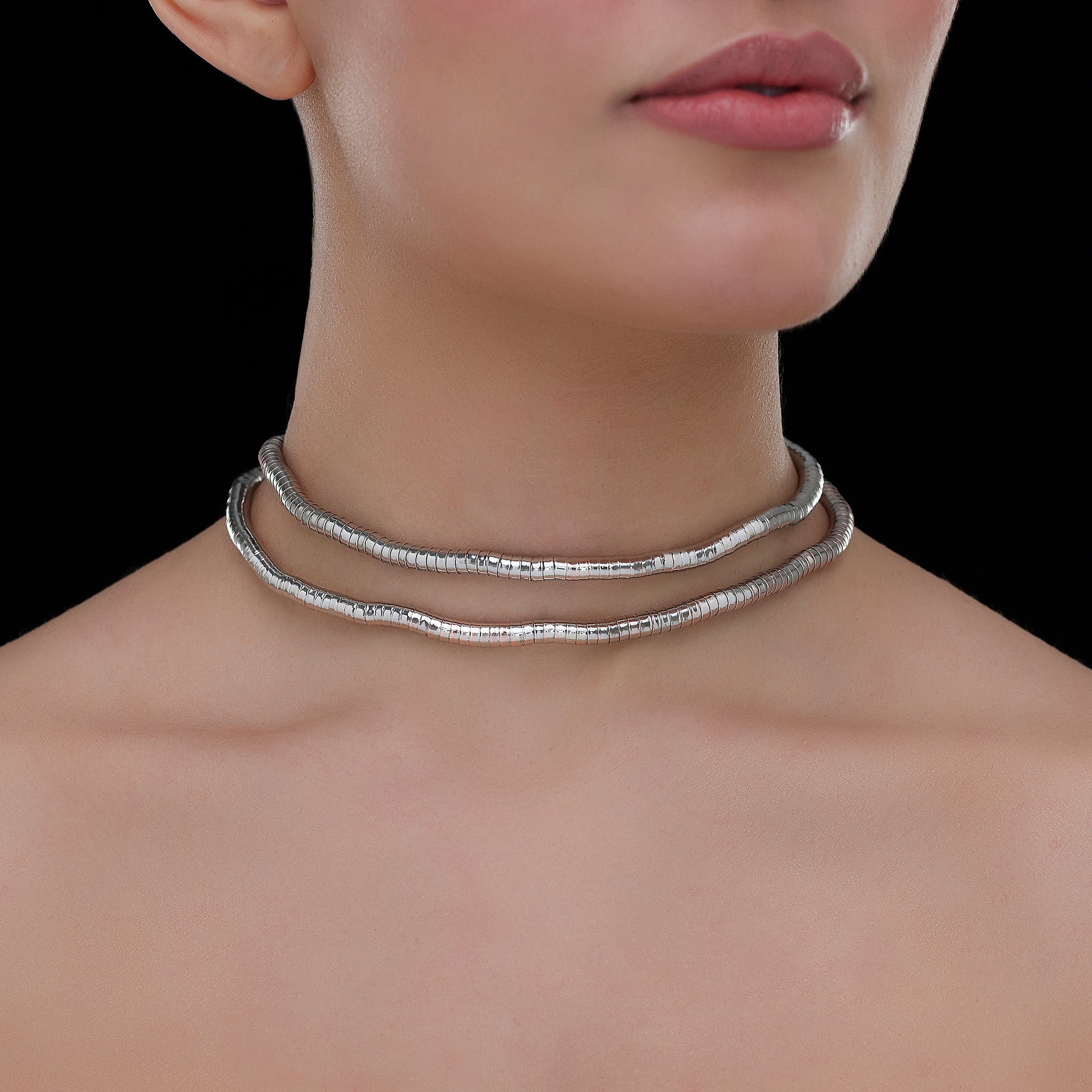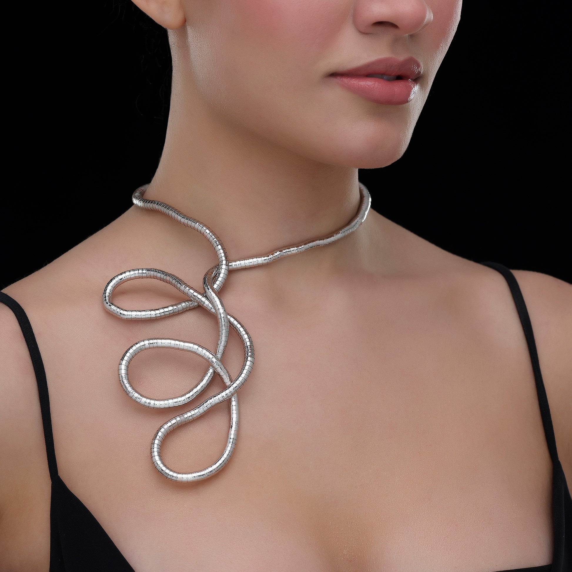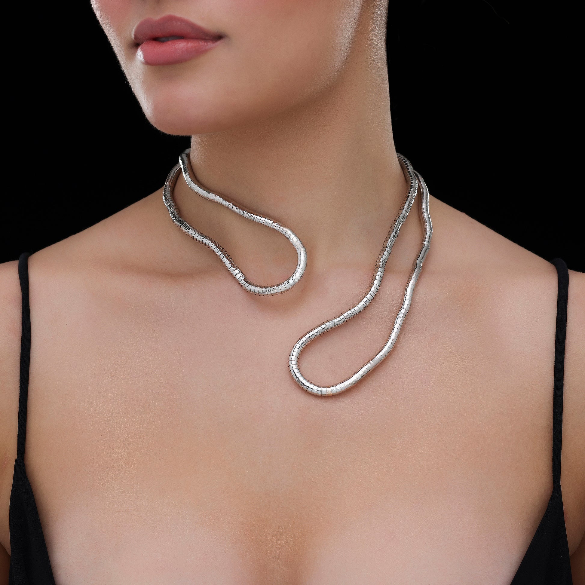 This bending silver necklace allows you to shape it as you choose and is made for effortless style and limitless imagination. You may experiment with different designs with a single item because to its robust, flexible structure, which bends gently to create custom forms. It looks well with both casual and evening attire thanks to its sleek silver finish, which gives it a sophisticated, contemporary sheen. Its flexible form allows it to be worn as a choker, mid-length necklace, or creative wrap-around piece, and its lightweight design guarantees comfort. This necklace stands out for its simple elegance and exceptional adaptability, making it a genuine statement necessity for people who value distinctive, versatile jewelry.