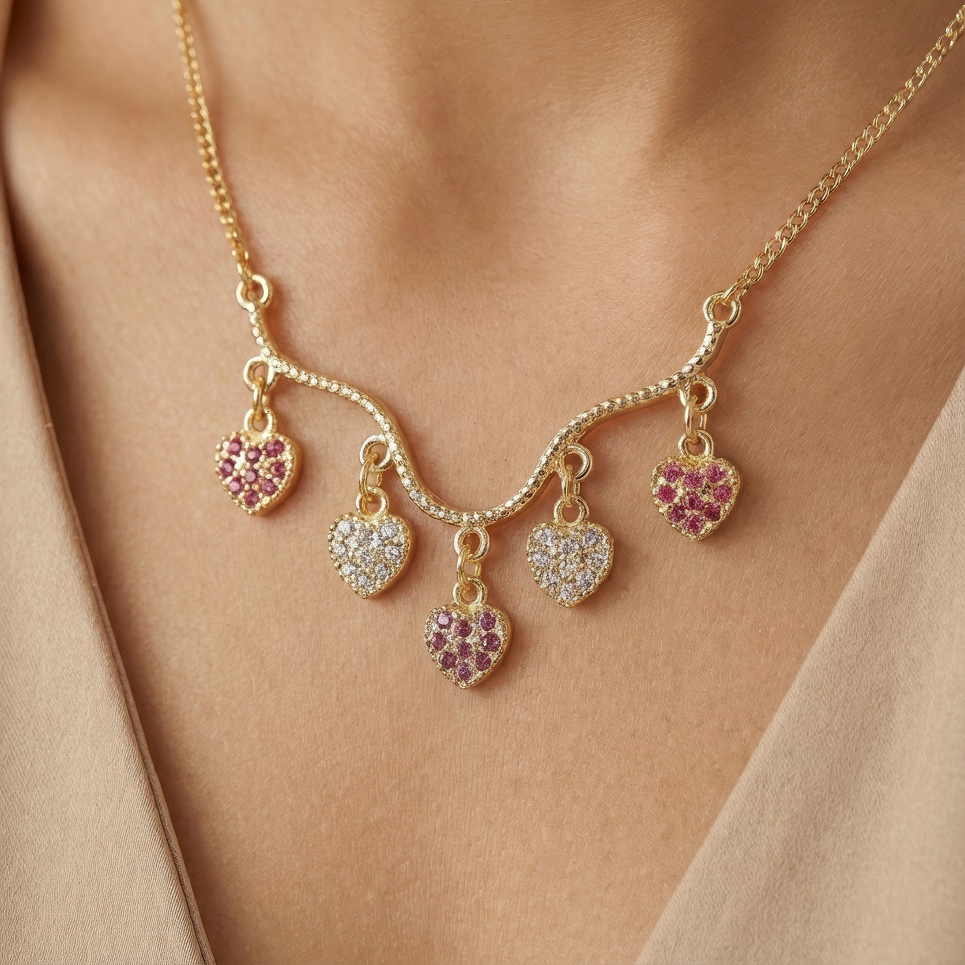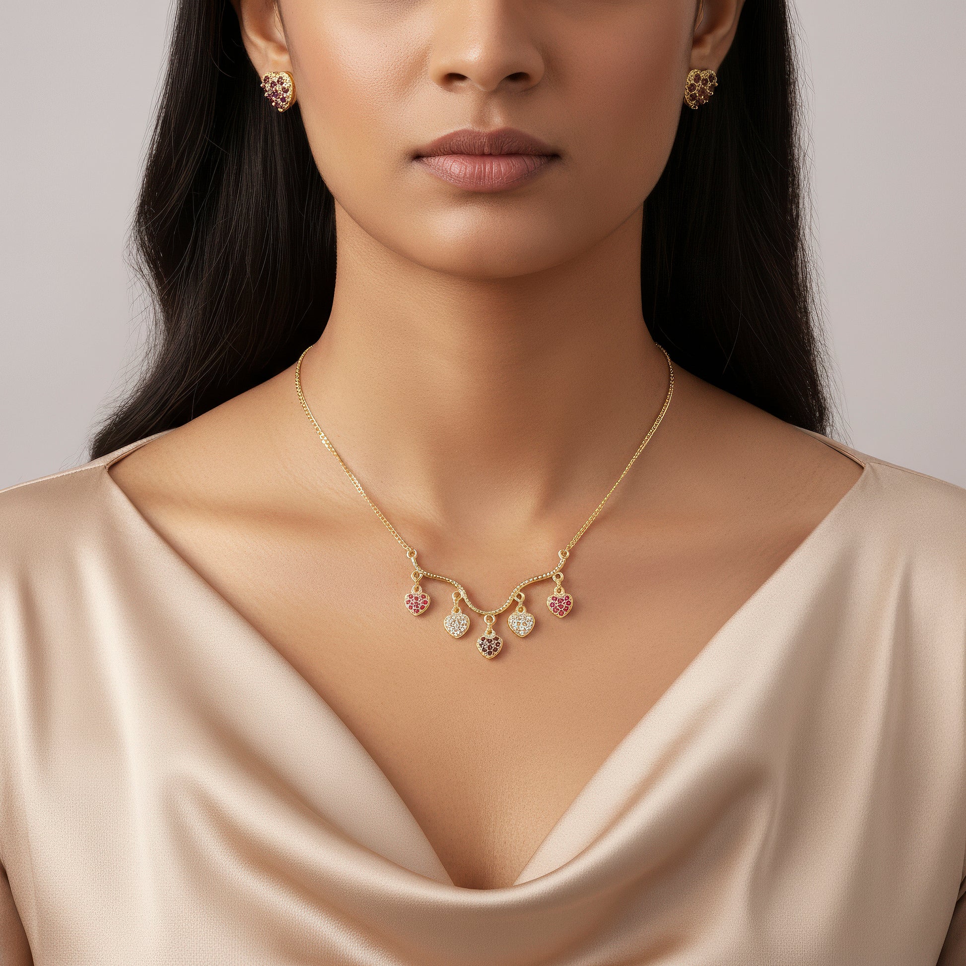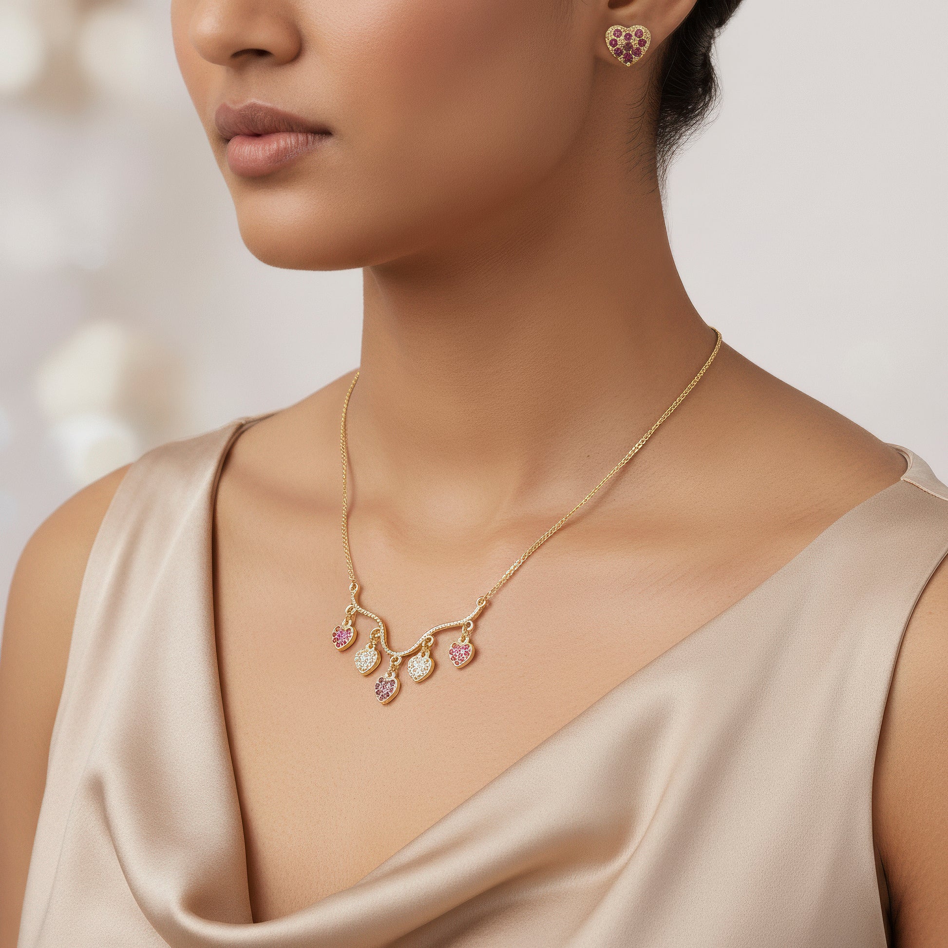Each delicate small heart charm in this adorable necklace and earring set is exquisitely encrusted with glittering crystals for a subtle yet alluring sparkle. The necklace's equally placed heart motifs lie elegantly at the neckline, giving it a beautiful and feminine appearance appropriate for any setting. The matching earrings mirror the same tiny charm, creating a coordinated and beautiful finish. Lightweight and comfy, the outfit is excellent for regular wear, special events, or gifting someone you love. Its delicate shimmer gives your look just the right amount of glitz without being overpowering. Whether worn together as a full set or combined separately with other accessories, it offers a sweet, timeless touch to every outfit.