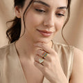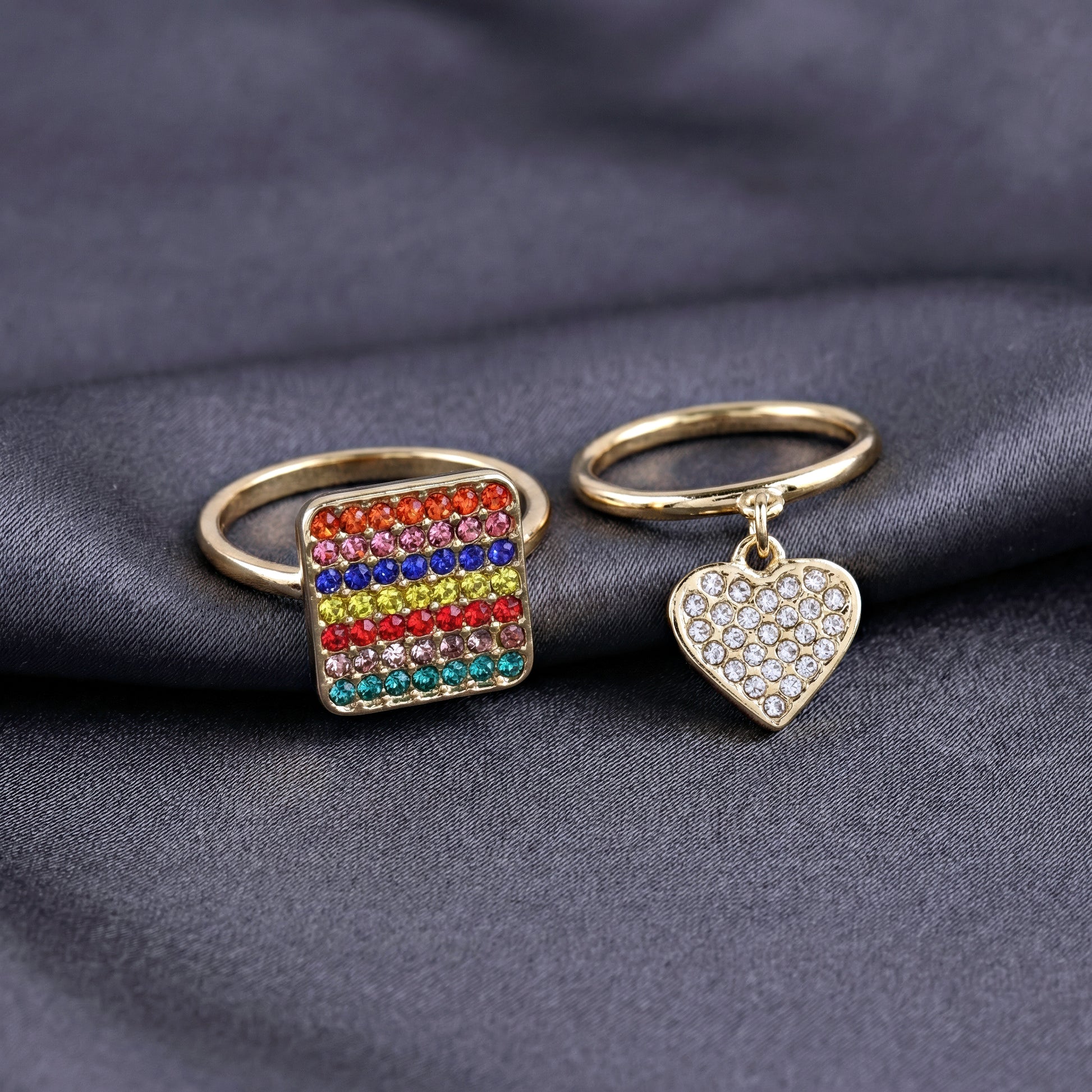 This stylish pair of rings offers the perfect balance of vibrant color and classic design. One ring has a heart-shaped charm with glittering white crystals for a delicate and elegant appearance, while the other has a square design studded with multicolored crystals for a vibrant and contemporary touch. These rings may be worn separately or stacked for a fashionable look, and they are made to go with both casual and party attire. The entire appeal is increased by the exquisite light reflection provided by the crystal embellishments. They go well with both fusion and western ensembles and are comfortable for both special occasions and everyday wear. This multipurpose ring set is a great way to add sparkle and charm to your regular accessories and is also a great choice for a gift.