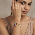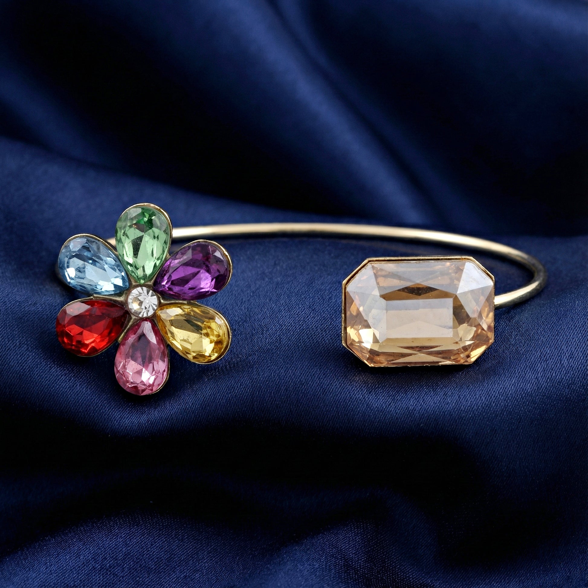 A sophisticated champagne-toned rectangular crystal and a lovely combination of multicolored flower decorations create the ideal balance of brightness and sophistication in this exquisite openable bangle bracelet. The delicate champagne crystal lends modest shine to the bracelet, while the intricate floral design adds a delicate, feminine touch. Easy wear and a secure fit are guaranteed by the openable clasp, which is designed with comfort and style in mind. It is appropriate for celebrations, weddings, parties, and evening get-togethers because of the multicolored elements' exquisite light reflection. Its adaptable style goes well with both contemporary fusion ensembles and ethnic clothing. This elegant yet striking bracelet elevates any ensemble and is a great addition to a well-chosen jewelry collection or a thoughtful present for special occasions.