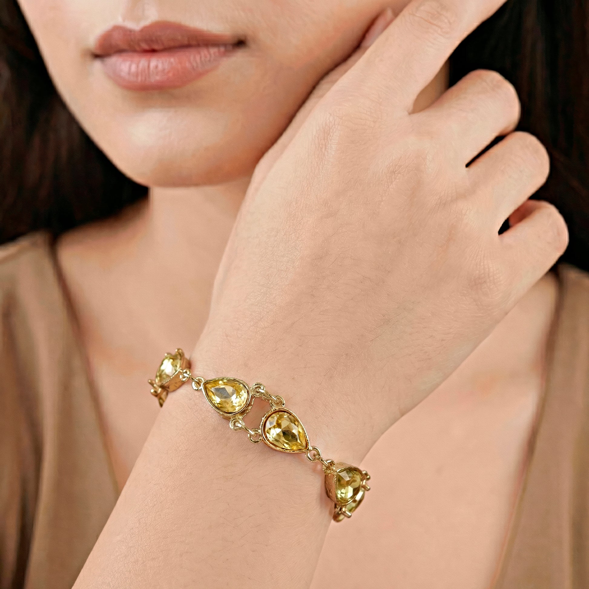 The delicately arranged waterdrop-shaped crystals on this sophisticated bracelet are set in a flexible form that easily glides with the wrist. In order to maximize brilliance, each crystal is carefully cut, producing a subtle yet striking shine from every perspective. The flowing design makes it simple to fit while still looking elegant and sophisticated. It is ideal for prolonged wear for festive occasions, festivities, or evening activities because it is lightweight and soft on the skin. The well-balanced arrangement of the crystals creates an opulent appearance without being overbearing or weighty. This bracelet is a flexible accessory that goes well with a variety of personal styles and events. It provides a subtle touch of refinement and charm to both classic and modern clothes.