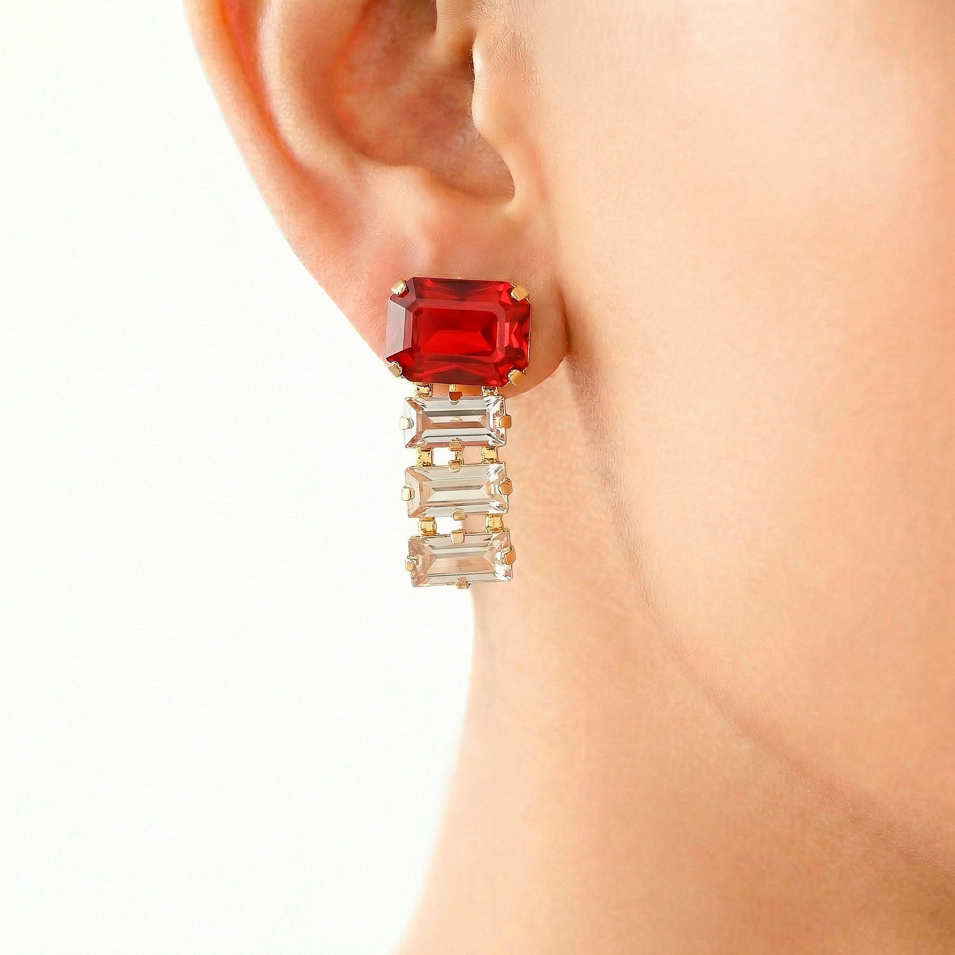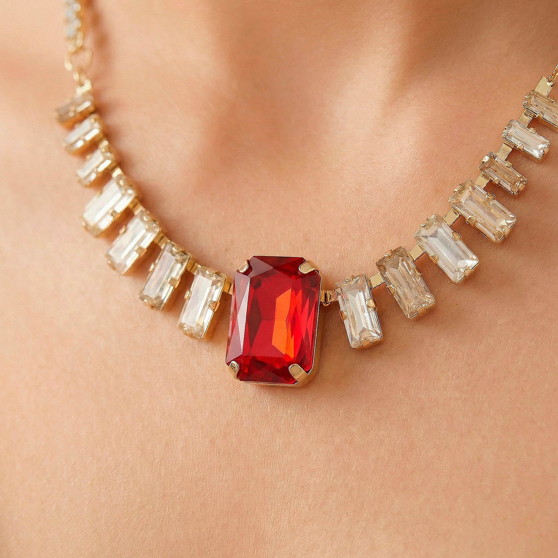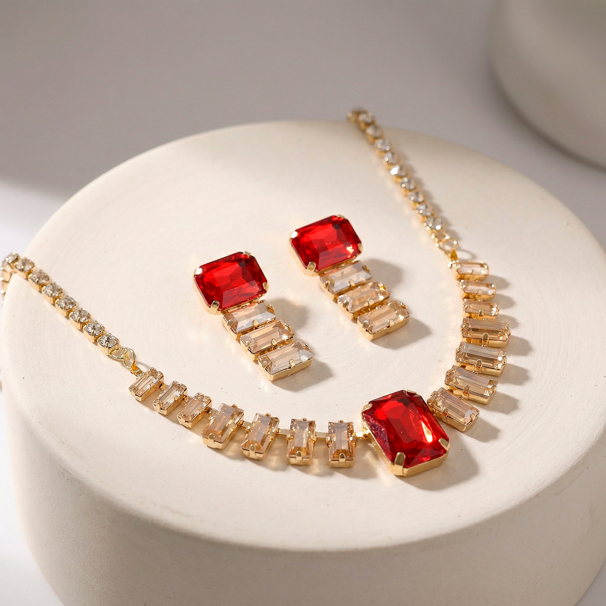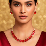 The purpose of this sophisticated necklace and earring combination is to make a striking yet tasteful statement. Clean lines and a modern silhouette are provided by the carefully placed baguette-cut crystals. Warmth, intensity, and a hint of regal charm are added to the entire appearance with the inclusion of a rich red crystal. The matching earrings frame the face with elegant brightness, and the necklace lays elegantly at the neckline, offering balanced sparkle without feeling heavy. This set goes well with both contemporary and ethnic ensembles and is ideal for weddings, celebrations, parties, and evening events. Your presence is effortlessly enhanced by its brilliant finish, which captures light from every angle. This set is perfect for people who value elegance with a self-assured, stunning appeal and timeless beauty because it is both comfortable to wear and visually arresting.