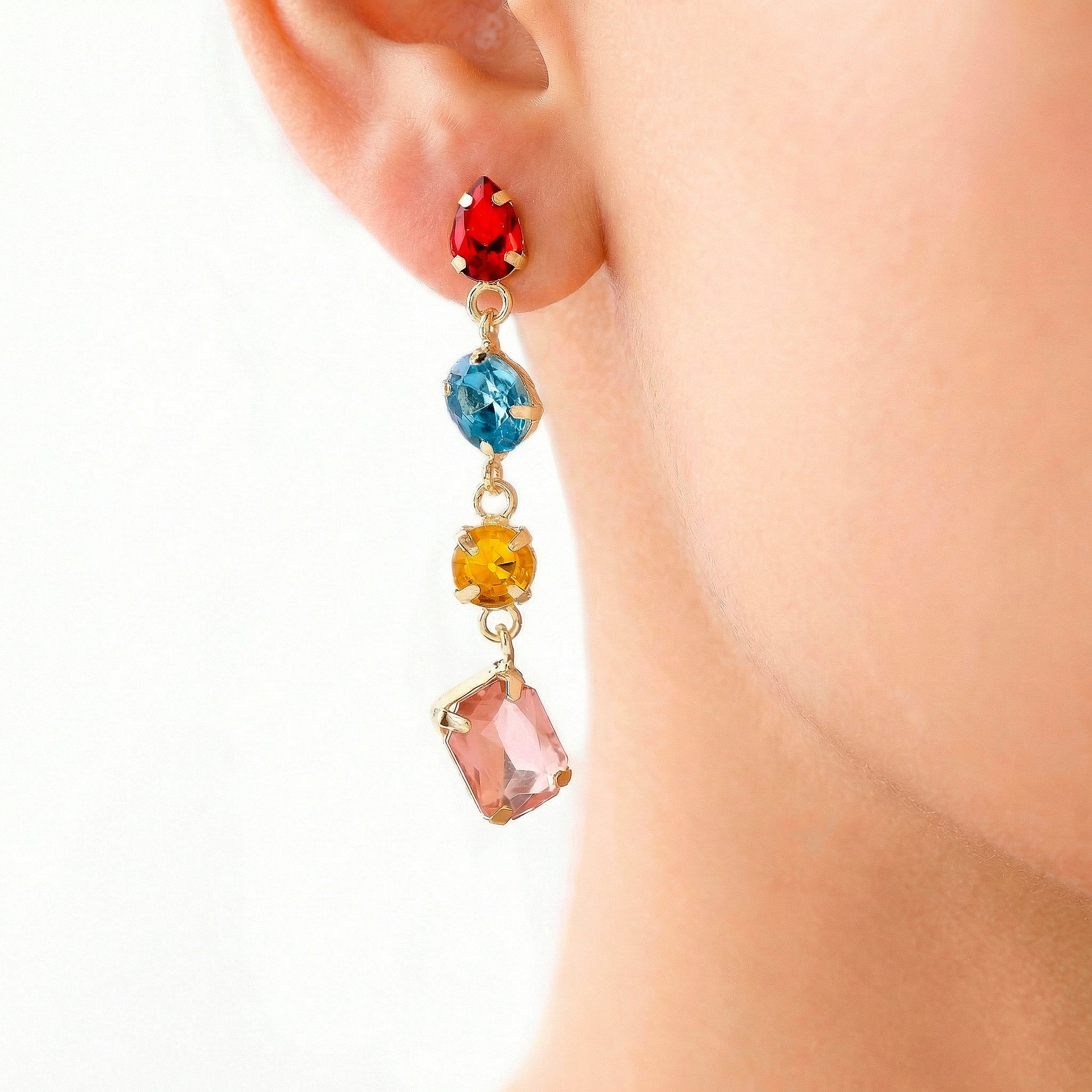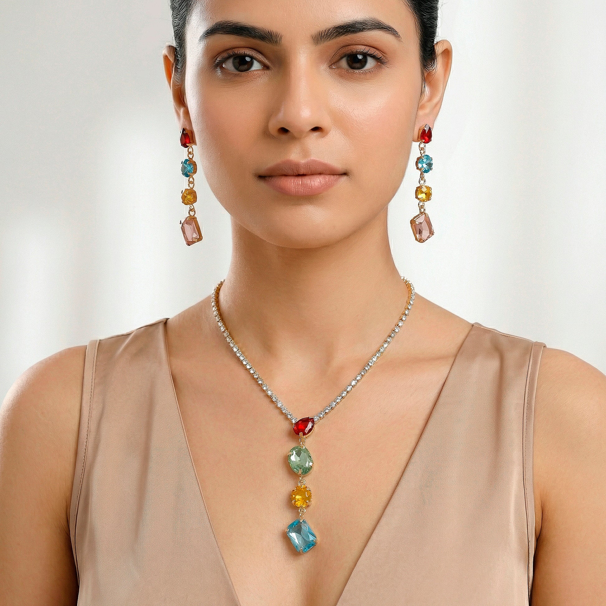 This collection of lengthy pendants and earrings is a striking display of current style and inventiveness. It adds a fun yet elegant elegance to any ensemble with its exquisite blend of multicolored stones in a variety of shapes. The matching earrings provide balanced color and glitter to the design, while the elongated pendant adds height and beauty with its beautiful vertical movement. A vibrant and striking appearance is produced by carefully positioning each form to reflect light from various perspectives. This set goes well with ethnic attire as well as fusion and modern clothing, making it perfect for celebrations, parties, cultural events, or statement fashion. It can be worn all day or at night without sacrificing comfort or light weight. For people who enjoy striking accessories, vivid colors, and creative designs, this package is ideal.