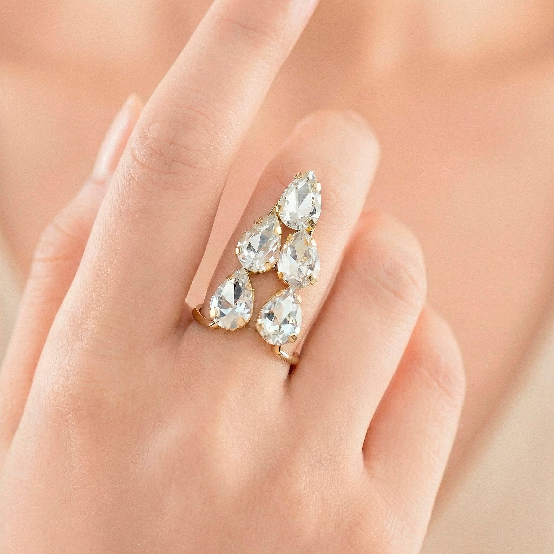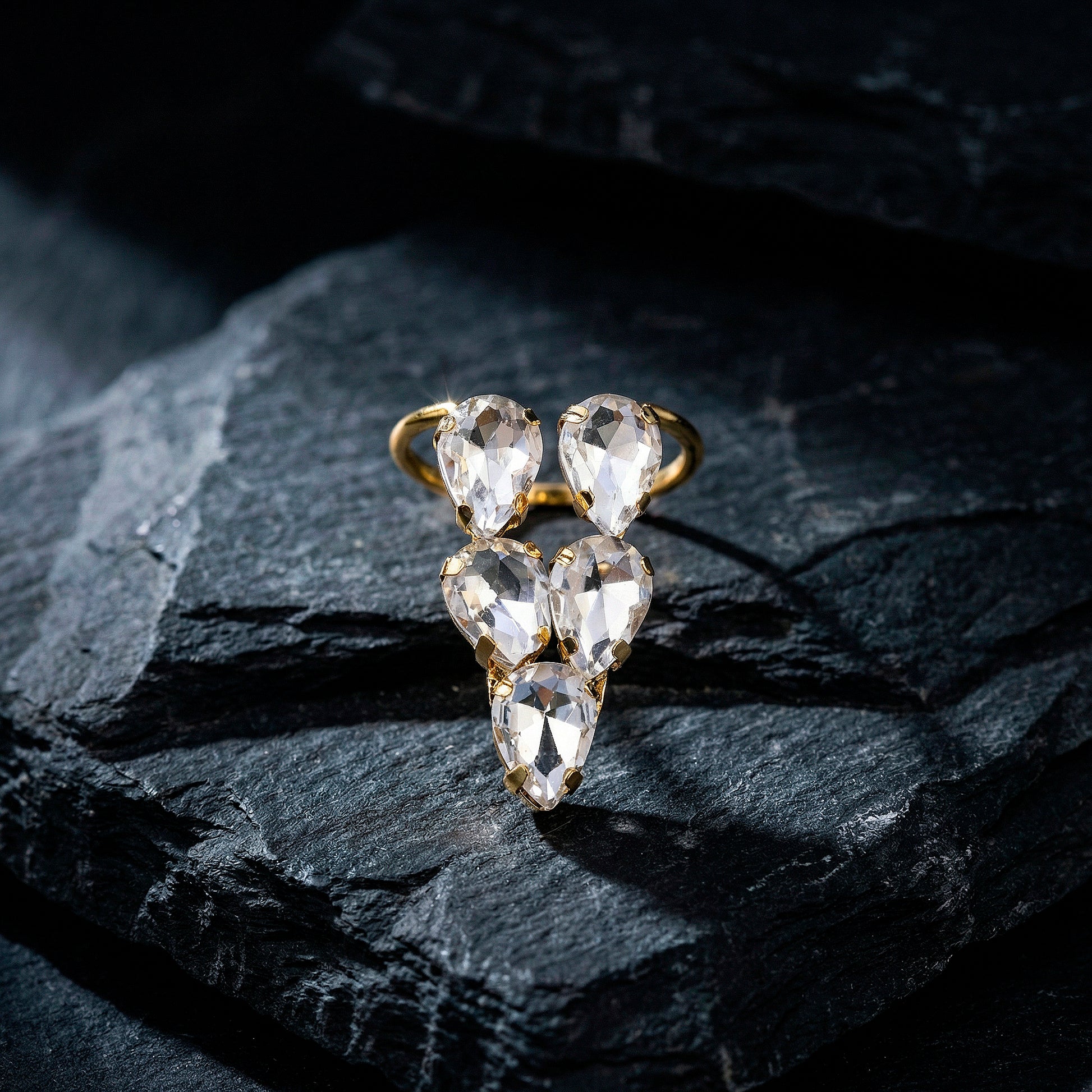 The sleek V-shaped design of this crystal ring gives your jewelry collection a contemporary and sophisticated touch. The angular form maintains a basic appeal while making a sophisticated statement thanks to the skillfully placed glittering crystals. The V-shaped curve gives the fingers a fashionable and attractive appearance. This ring goes well with casual attire, business attire, and evening ensembles, making it ideal for both special occasions and daily wear. It can be worn alone for a discreet look or layered with other rings for a fashionable effect thanks to its simple design. It is made for easy style and long-lasting wear, and it is lightweight and comfy. For people who value modern elegance with a touch of glitter and sophistication, this ring is perfect.