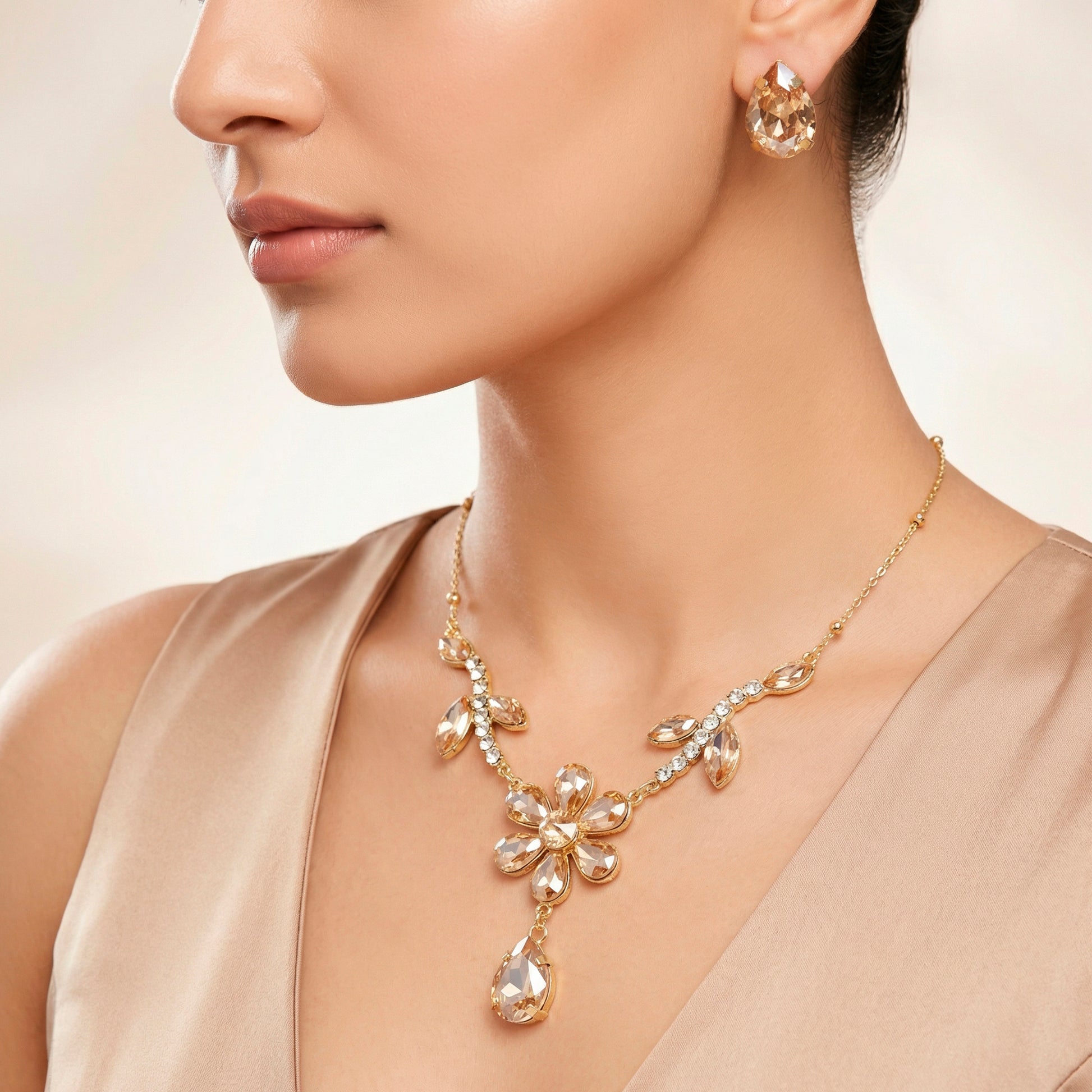 The elegant flowery design of this crystal necklace and earring set adds a touch of charm and refinement to your outfit. A sophisticated yet striking appeal is produced by carefully placed crystals that create flowery patterns that dazzle exquisitely with each movement. The matching earrings lend balanced sparkle and grace to the design, while the necklace sits softly along the neckline, bringing tenderness and sophistication. This set goes well with ethnic, fusion, and modern ensembles and is perfect for weddings, celebrations, parties, and special events. It is appropriate for both daytime elegance and evening splendor due to its timeless flower influence. It is made to be worn for extended periods of time without causing discomfort and is lightweight and comfy. For people who appreciate traditional beauty, delicate shimmer, and feminine designs in accessories, this combination is ideal.