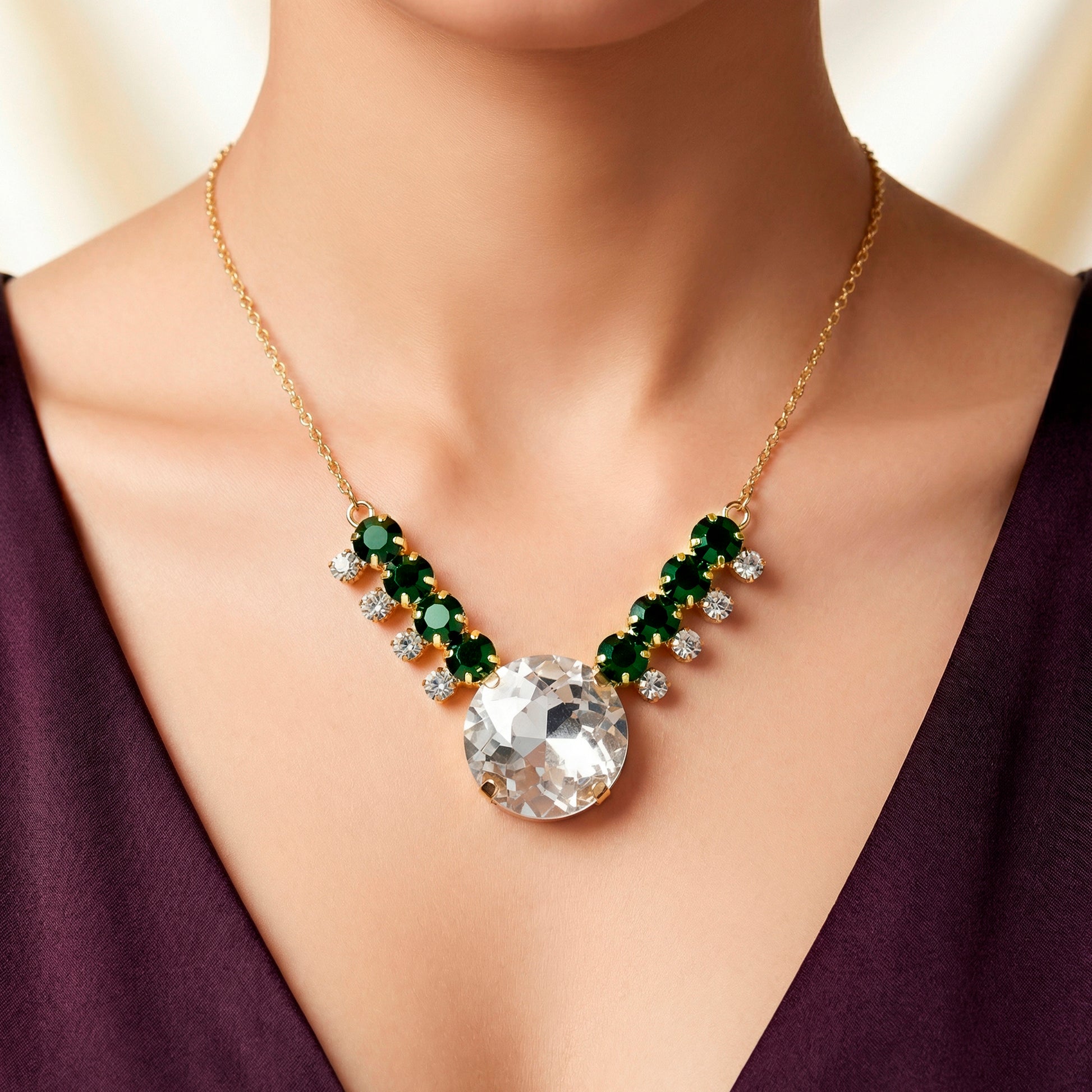 This large round crystal necklace and earring set will make a statement at any event. The necklace's large, perfectly spherical crystals capture light from all sides, giving it a bright, striking appearance. The same circular brilliance is echoed by matching earrings, which effortlessly glamorize the face. The set rests comfortably and produces spectacular shine because it is designed to strike a balance between statement grandeur and elegant beauty. It looks great with both traditional and modern attire, making it perfect for weddings, holiday festivities, evening parties, or special occasions. The bright crystals instantly elevate any look, and the classic round silhouette guarantees versatility. This piece enhances your appearance with confidence, brilliance, and a memorable presence, whether it is worn alone or as part of a set.