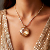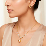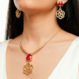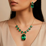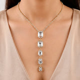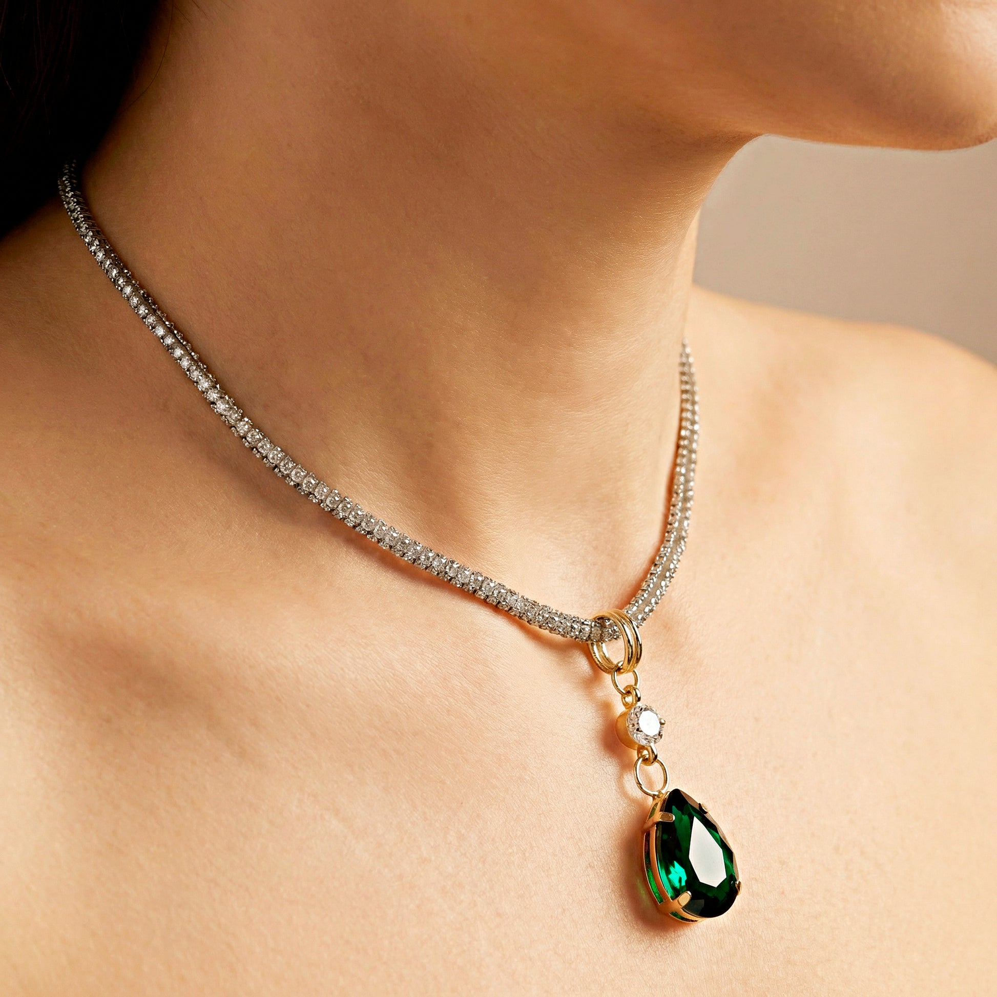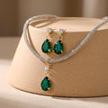 The crystal-studded rope design of this sophisticated necklace and earring set flows elegantly into a magnificent drop-shaped crystal pendant. The pendant's smooth, elongated form creates a sophisticated focal point, while the rope pattern adds complexity and sparkle. The same drop crystal detail is echoed in matching earrings, creating a flawlessly balanced and harmonized appearance. The set is appropriate for weddings, celebrations, parties, and evening wear since it is made to provide delicate brilliance with classic charm. It is cozy and light, fits perfectly around the neck, and adds a subtle sheen to the face. This set's fluid crystal drops, and structured rope design make it a flexible addition to both classic and modern jewelry collections.