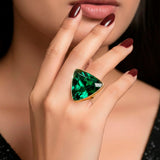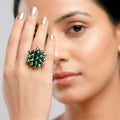 This colorful cocktail ring has an eye-catching cluster of rainbow-colored crystal beads that have been carefully placed to provide a bold and distinctive design. The combination of vibrant gemstones reflects light from every direction, creating a vibrant dazzle that instantly improves your appearance. The clustered design provides depth, texture, and whimsical elegance, making it perfect for anyone who enjoy striking accessories. It is ideal for parties, festive festivities, weddings, and special evenings because it is both comfortable to wear and visually striking. It is a versatile styling option because of its rich color combination, which makes it easy to mix with both neutral and lively ensembles. This ring adds a dash of glitz, individuality, and joyous charm to any ensemble, whether it is worn as a prominent piece on its own or combined with little jewelry.