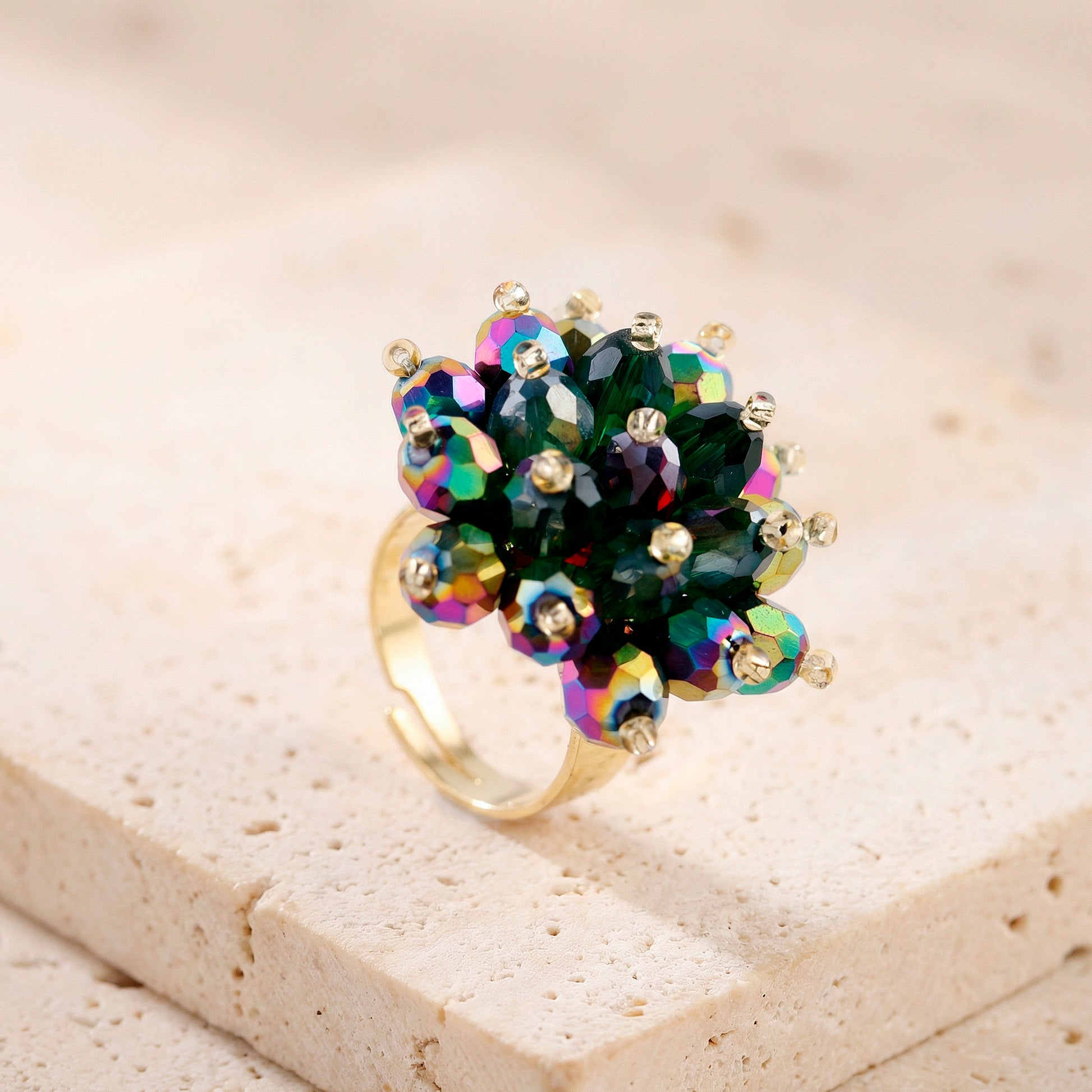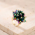 PRAO Ring Anti-Tarnish Rainbow Beaded Crystal Cluster Cocktail
