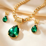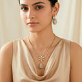 A delicate drop-shaped flower pendant adorned with glistening rhinestones and a delicately wrapped chain that provides a lovely flow to the design are characteristics of this exquisite jewelry set. The floral beauty of the pendant is reflected in the matching earrings, making for a flawlessly harmonized ensemble. The set is perfect for festive gatherings and special occasions because of the way the sparkling stones capture the light. It is comfortable and light enough to wear for extended periods of time without feeling heavy. It looks high-end because to its sophisticated finish and detailed embellishments, which go nicely with party clothing, ethnic attire, or even a basic evening gown. This necklace and earring combination lends a sense of refinement, elegance, and understated beauty to any ensemble, whether it is worn for weddings, parties, or as a gift.