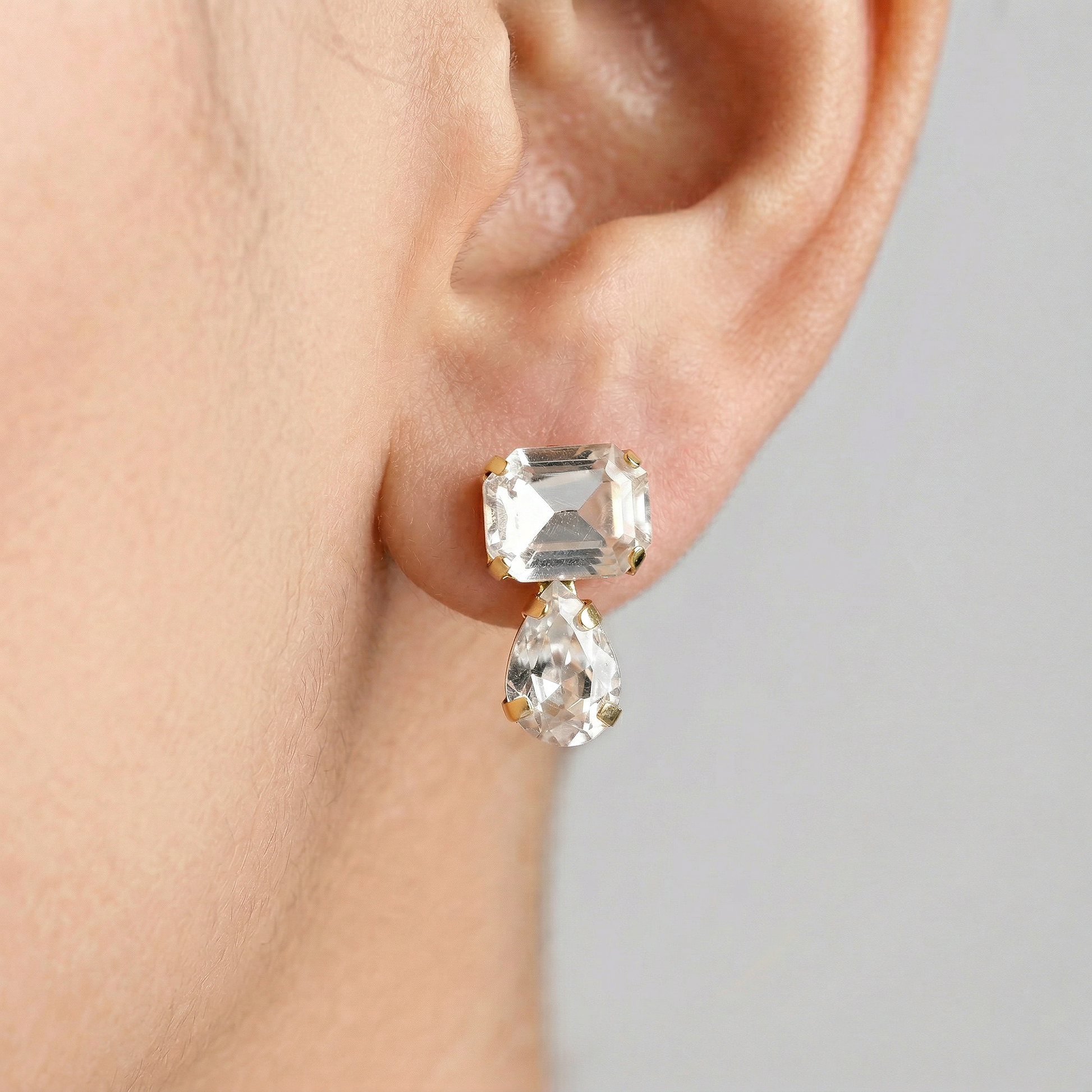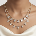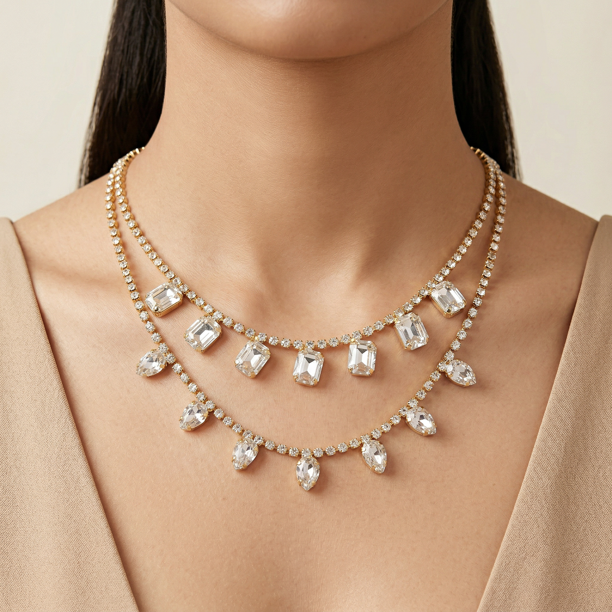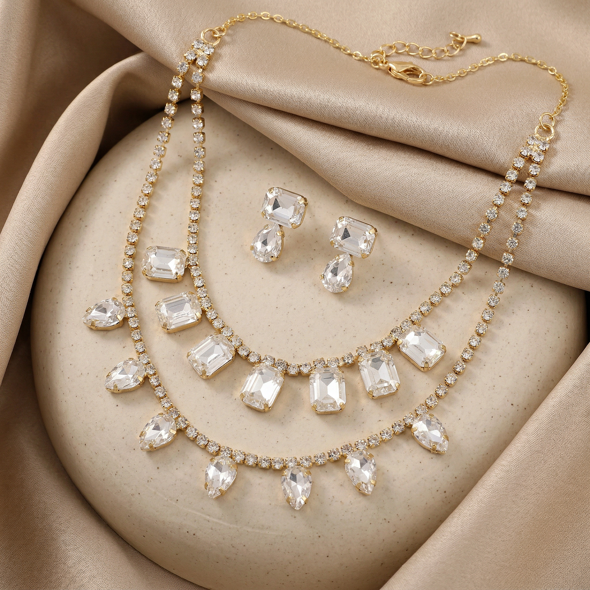 This exquisitely crafted jewelry set, which includes a lovely double-layer necklace, will add sophisticated shine to your ensemble. While the lower layer is embellished with exquisite drop-shaped crystal charms that produce flowing movement and striking brilliance, the upper layer showcases sleek rectangular crystals for a structured, contemporary touch. It is a striking addition to daytime and evening attire because of the layered pattern, which provides depth and complexity. The matching earrings provide a well-balanced and elegant finish by echoing the rectangle and drop motif. The set's meticulous construction guarantees a cozy fit and a tight closure for extended wear. Perfect for cocktail parties, weddings, and other special events, this ensemble adds classic glitz and sparkle to both ethnic and western attire.